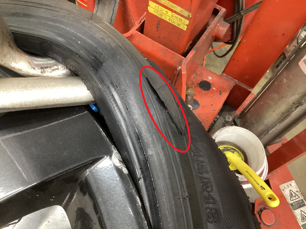【原因】タイヤのサイドウォール部分を強打したことにより、ゴムが裂けてしまう現象