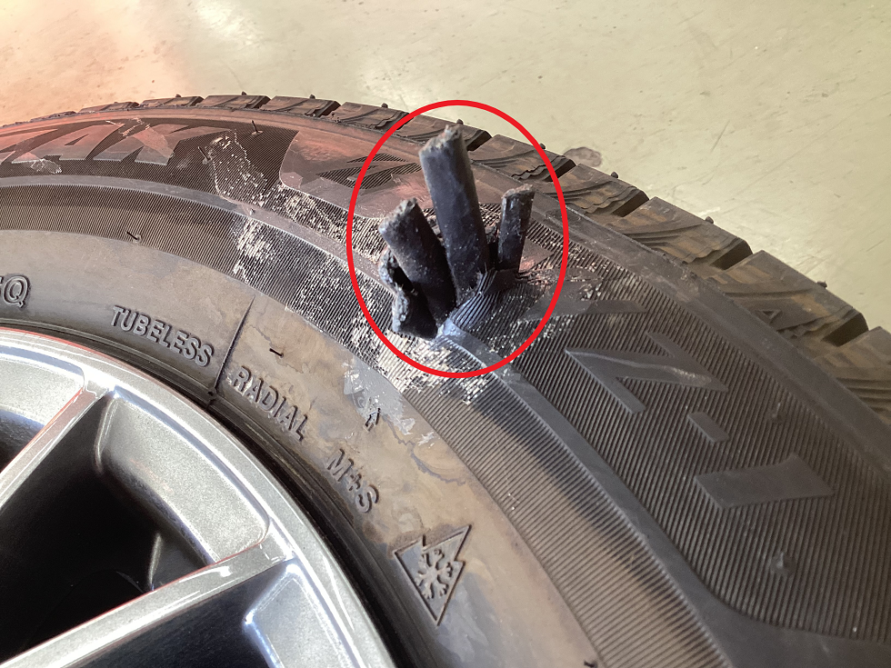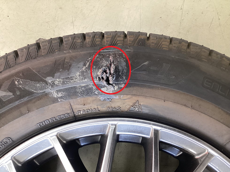 ①タイヤの側面をぶつけてしまい、タイヤに穴が開き空気が漏れ始めた。