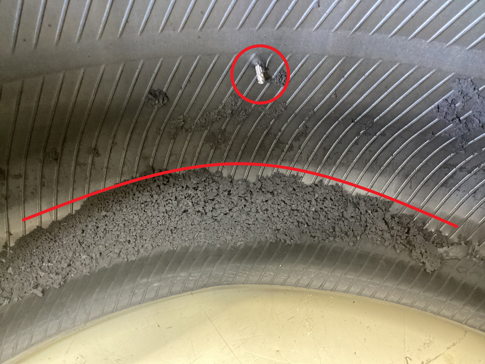 外傷がある場合、タイヤの中は削られてこのような状態になっています!! 赤〇=異物