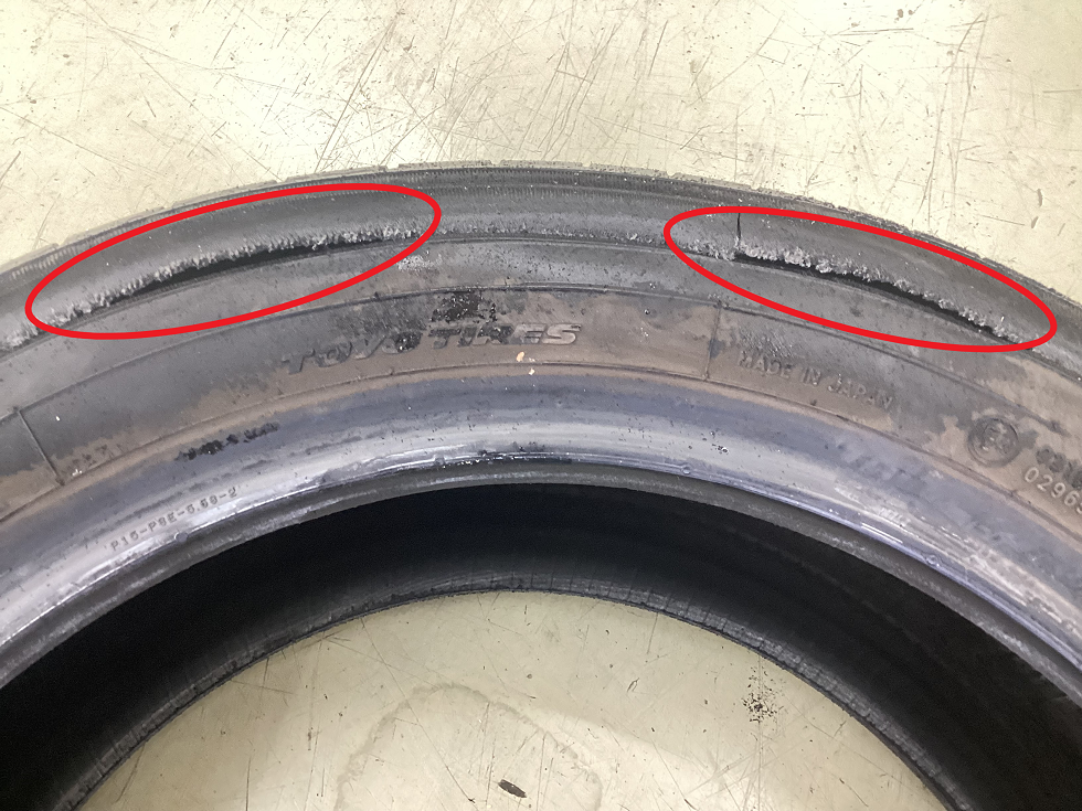 タイヤの側面が、2箇所に渡り大きく裂けていました!!