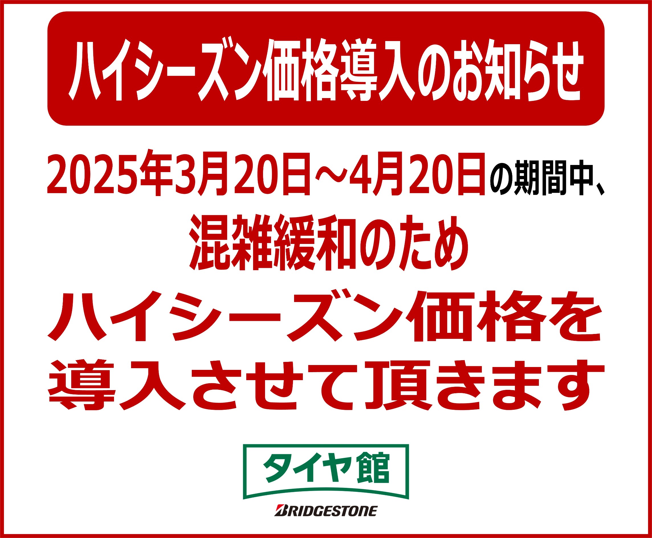 【重要】3.4月ハイシーズン価格のお知らせ 2025年2月23日 脱着工賃に関するお知らせです いつもタイヤ館甲賀をご利用いただき ありがとうございます! 混雑緩和の為、 今春はハイシーズン価格の設定をさせて頂きます。 ◎ 期間 ⇒ 2025年3月20日~2025年4月20日 ◎ 価格 ※クローク会員様は通常価格となります。 ※上記価格にセンターフィットは含まれておりません。 期間外は通常価格での作業となりますので、 履き替えをご検討中のお客様はお早めのご予約をお願い致します。