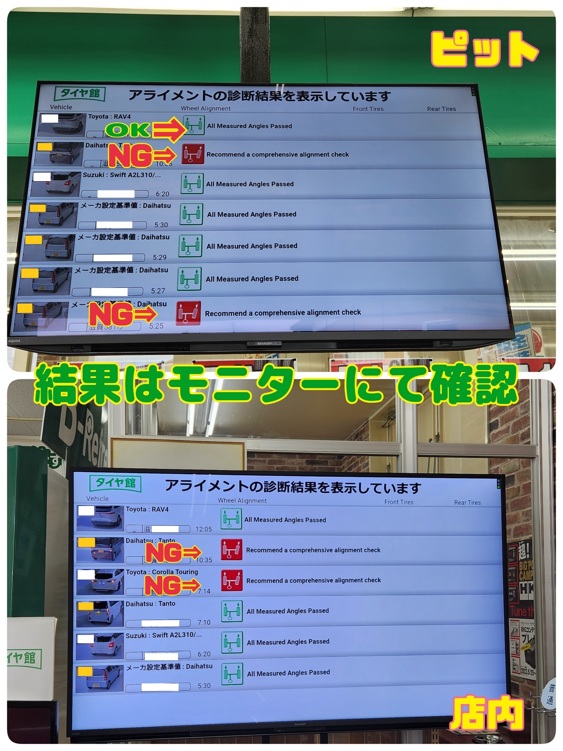 良否判断はPITと店内にある大型モニターで映し出されます。