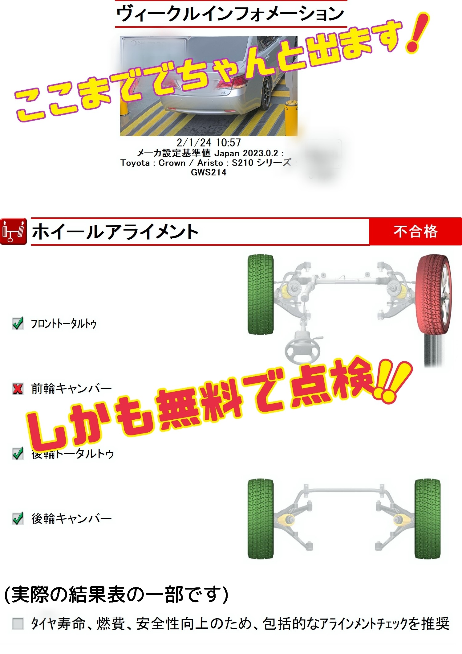 全車両無料でアライメント測定サービスを行なっている全国唯一のお店です!!!