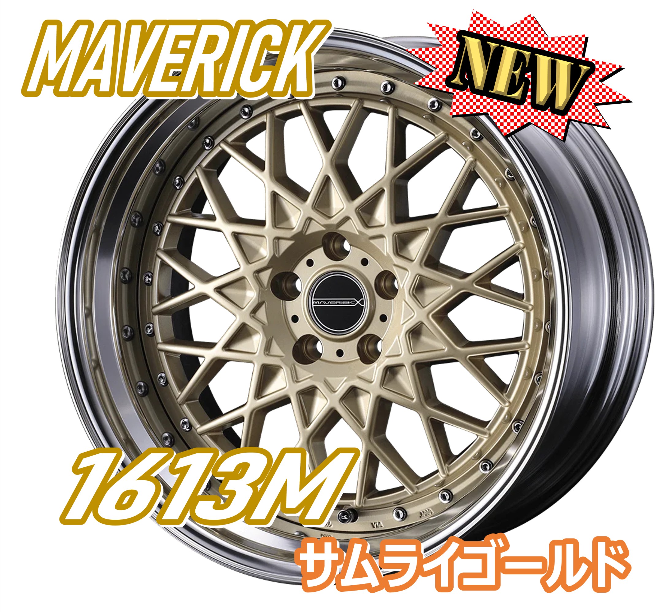 ミリ単位でサイズオーダーが可能な2ピースのマーベリックからは、クラシカルな雰囲気を醸し出す13交点のメッシュが追加されます。緩やかにラウンドしたメッシュディスクはセンター部を削り落としたような落とし込み形状を設けることで、全体の奥行感を出しています。またディスク外周のピアスボルト付近は一段下げることにより、リムの深度をアップさせることに成功。同サイズの他ホイールに比べて深リムを獲得できます。