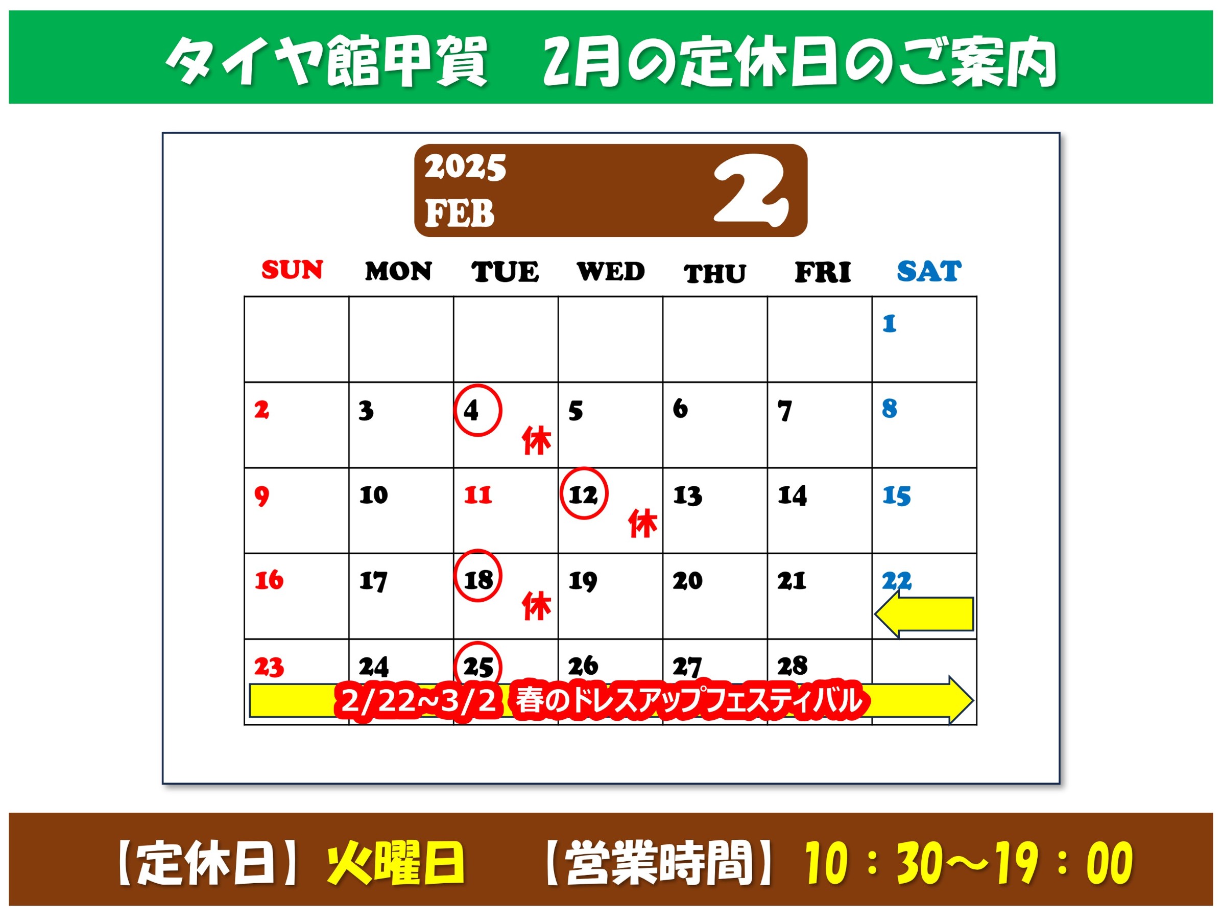 タイヤ館甲賀 2月の営業日のご案内☆彡