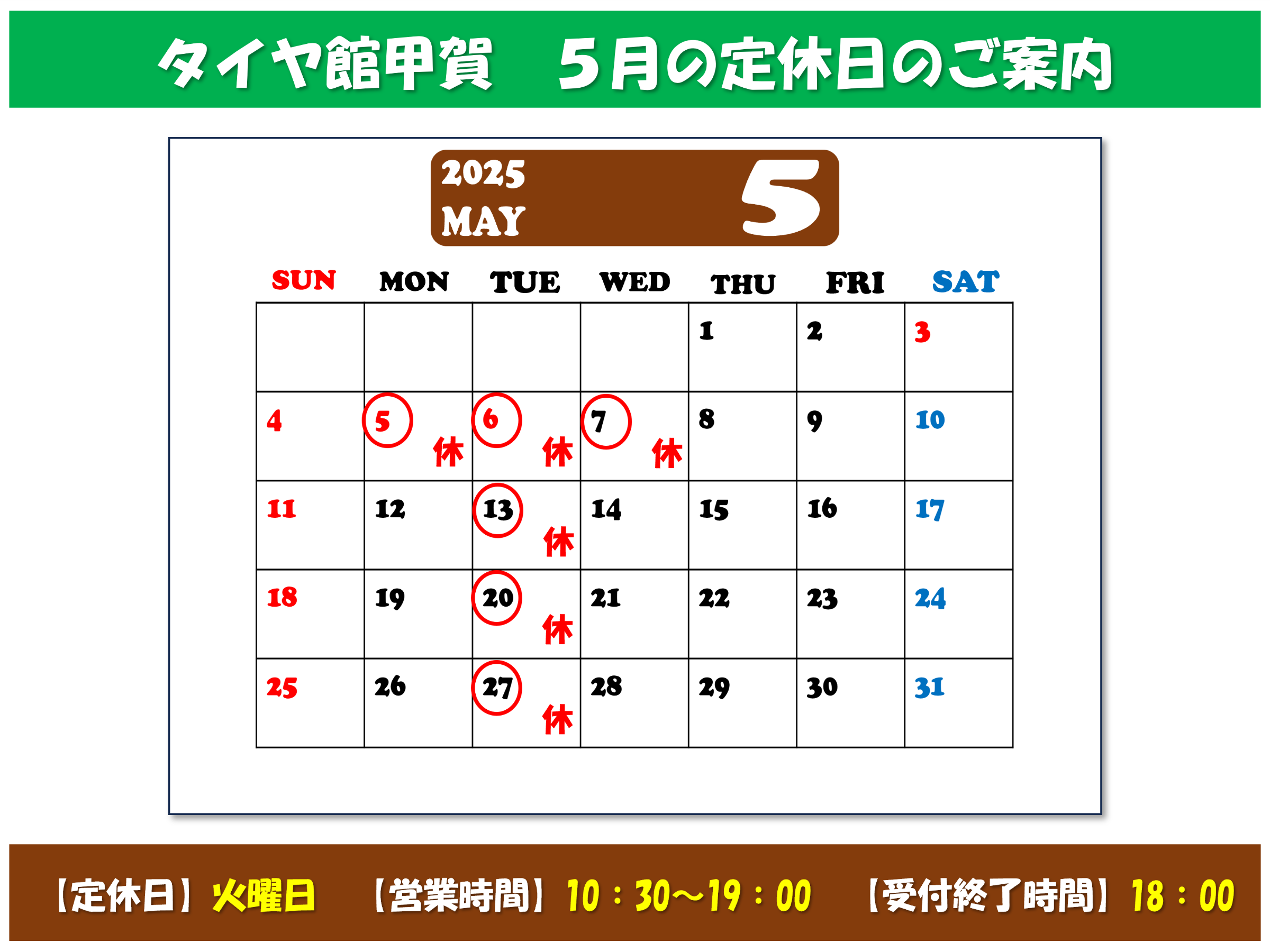 タイヤ館甲賀 5月の営業日のご案内☆彡