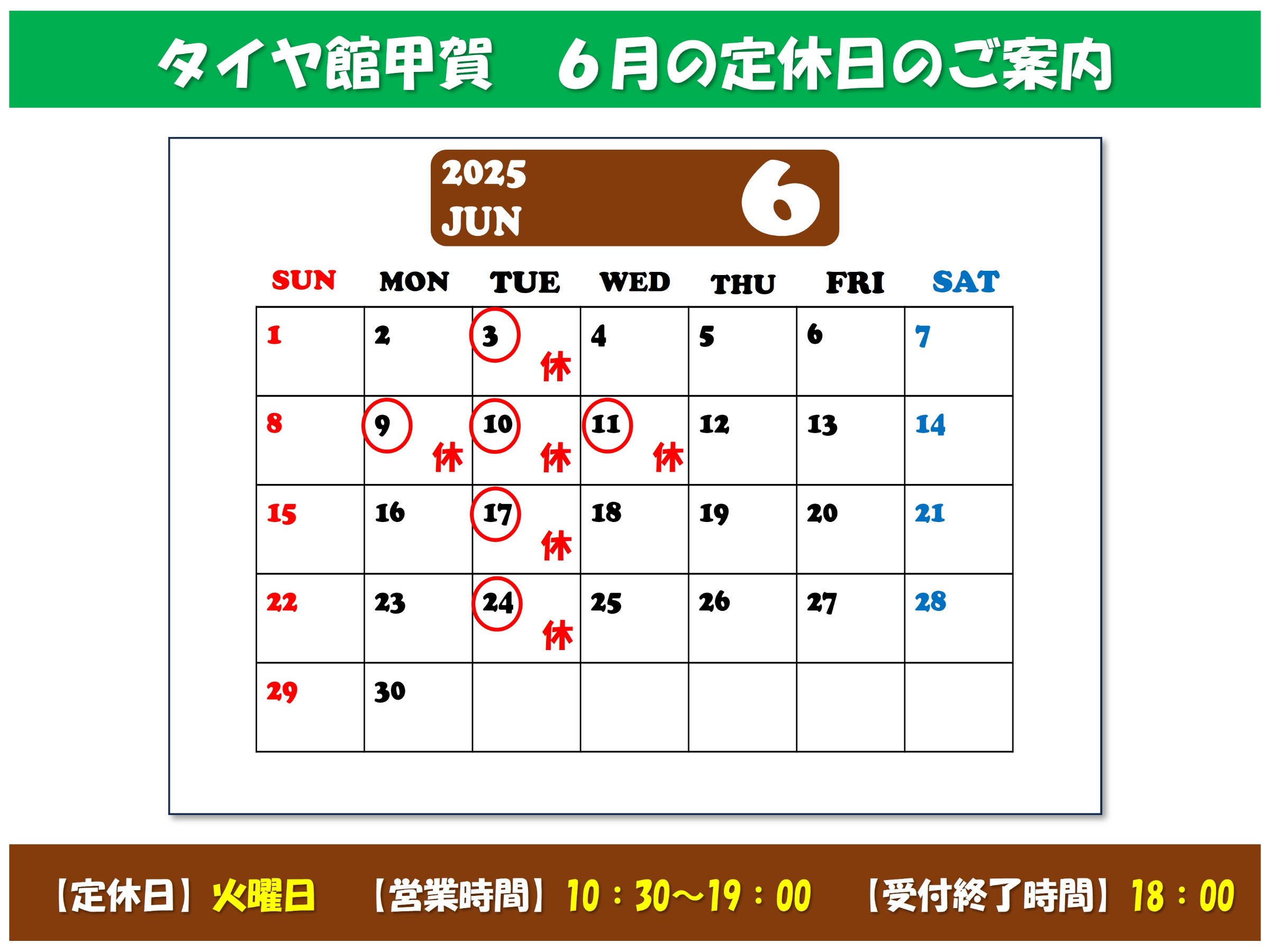 タイヤ館甲賀 6月の営業日のご案内☆彡