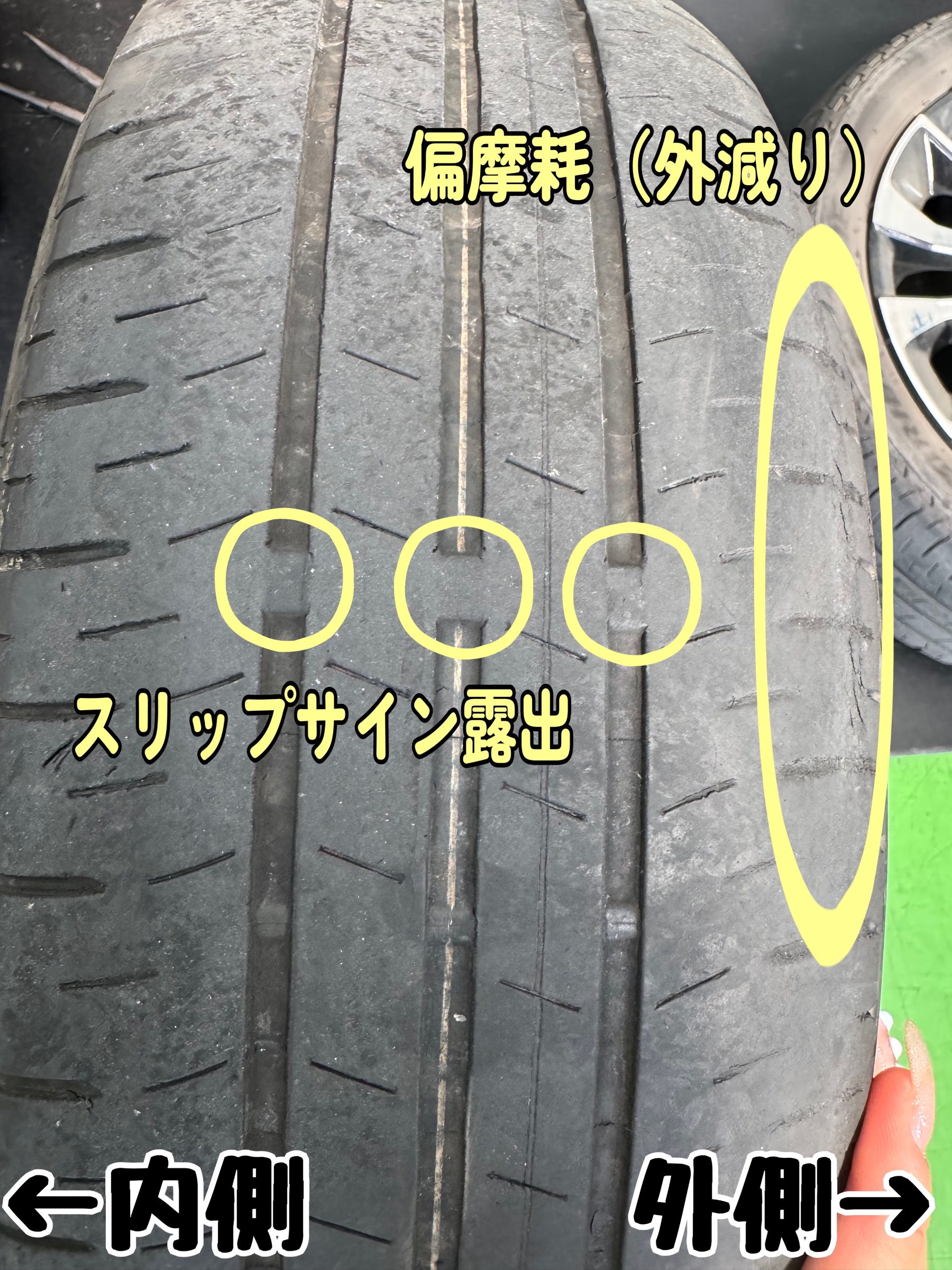 タイヤの外側に偏摩耗もみられました。