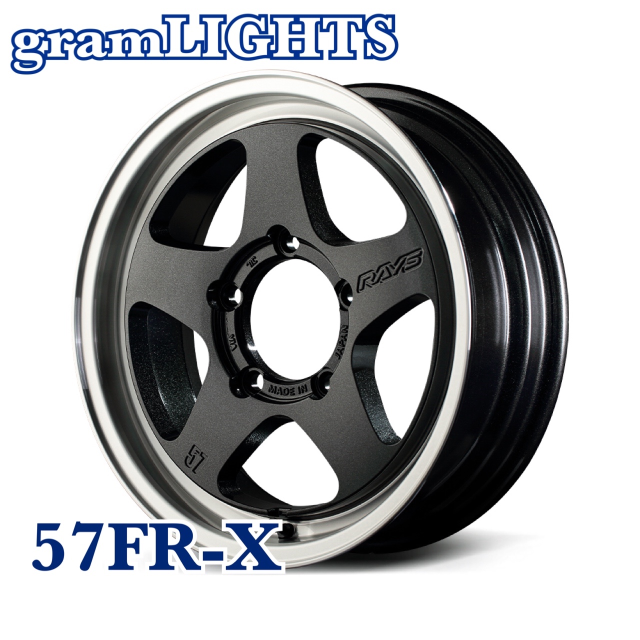 ジムニー、ジムニーシエラに向けたグラムライツの新提案「57FR-X」。スポーツ性能を求めると細身のスポークを選択することが多い中、今回の「57FR-X」ではあえて太く無骨な5本スポークデザインを選択。オンロードからオフロードまで幅広いユースのジムニーだけに、剛性を求め太めのスポークデザインを採用しました。また、レイズ初となるフロントリム部へのRCFを採用。圧延加工により素材のポテンシャルを引き出し、さらなる軽量性と強度・剛性を両立させました。
