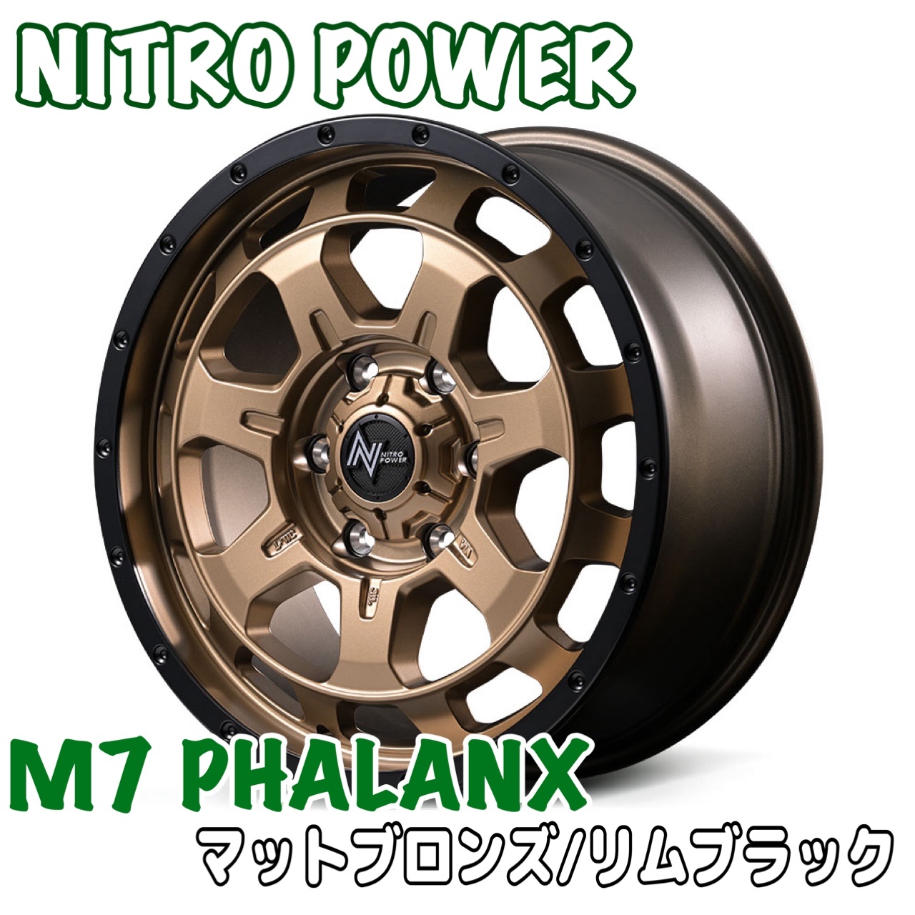 2025年NITRO POWER 新作ホイールはシリーズ初のスポークエンドを大胆に撃ち抜いたようなデザインのシューティングホールが特徴的なM7 ファランクス。リムデザインはシンプルなビードロックデザインで、ウェルから立ち上がったリムフランジをアンダーカットし立体的なビードロックデザインに。スポークエンドに施されたシューティングホールはナイトロらしくラギッドな印象を創り出すためダイナミックに12ホールをレイアウト。大きめにデザインされたシューティングホールはタフで重厚感あるデザインの印象を与えながら軽量性を両立。7本のパワースポークはナイトロパワーのテーマであるアメリカンヘヴィーデューティを表現するためあえて極端に短く構成することで塊感と落ち込み感のある断面をデザイン。またスポークセンターには無骨なカービングディテールで装飾し、ワイルドながらギア感を表現。センターパートではナットホール形状を利用し、センターサークルの立ち上がりにもう1段サークルを設けセンターの深さを演出。塊感のあるアメリカンタフデザインで4×4の足元を飾る。