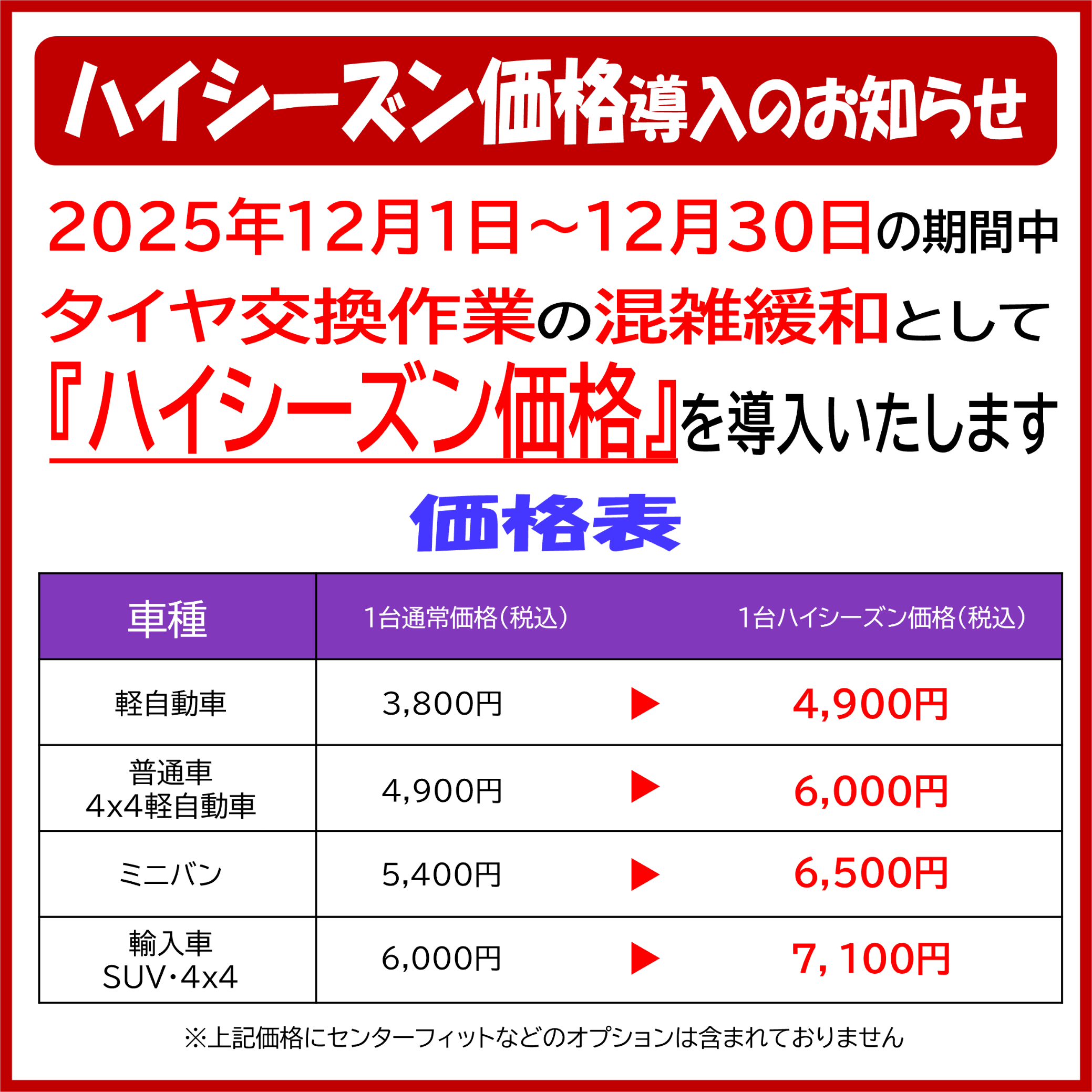 タイヤ履き替え作業【ハイシーズン価格】導入のお知らせ