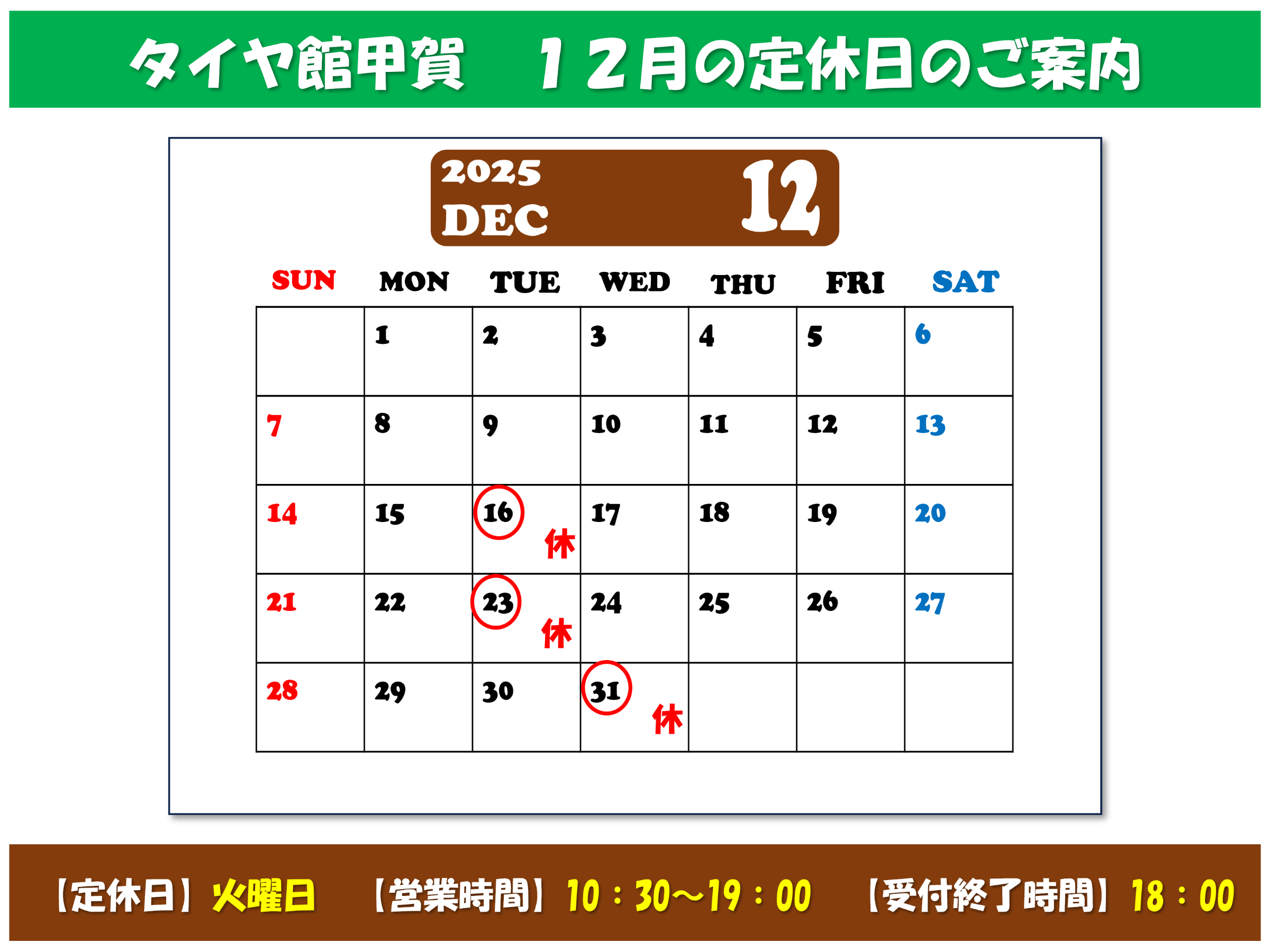 タイヤ館甲賀 12月の営業日のご案内☆彡
