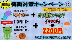 いつもタイヤ館甲賀を ご利用いただきありがとうございます 毎日暑い日が続いています! 皆さん熱中症には気をつけて下さいね これだけ暑いと急な雨が心配です! さてタイヤ館甲賀では 5月より梅雨対策キャンペーンを 行なっています! ワイパー /1本〜+ ガラス撥水コーティング または 撥水タイプ/...