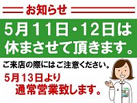 誠に勝手ながら 5月11日、12日の2日間 お休みをいただきます。 ご来店の際にはご注意ください。 5月13日より通常営業致します。 ご迷惑をお掛けしますが 宜しくお願い致します。