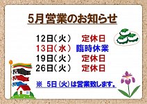 いつもタイヤ館甲賀をご利用下さいましてありがとうございます! 今日から5月ですね! 天気予報では暑い日が続く模様。。。 気温の変化なども含め、皆さん体調には十分お気をつけ下さいね☆彡 さて、5月の営業のお知らせです(^^) 今月は、5日(火)は営業日となります。 また、13日(水)を臨時休業とさ...