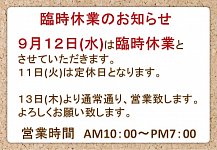 誠に勝手ながら、9月12日(水)は臨時休業いたします。 ご迷惑お掛けいたします。