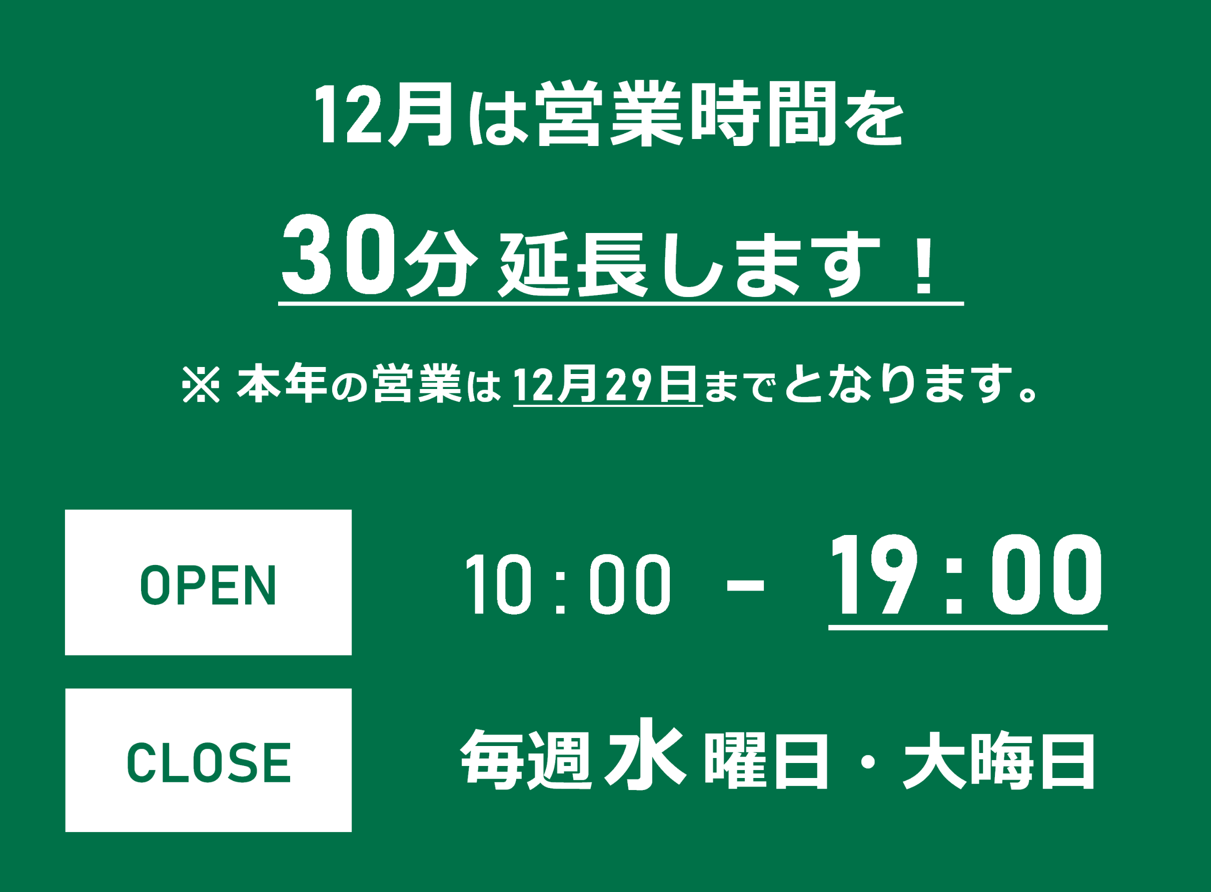 【12月のみ】営業時間延長のお知らせ ポスト 2020年11月30日 当店をご利用いただきありがとうございます。 12月のみ、営業時間を30分延長して『19:00 』まで営業致します! 感染症対策も万全!スタッフ一同、皆様のご来店をお待ち致しております! ※ 本年の営業は『 12月29日(火)』までとなります。予めご了承ください。 担当:イナトミ