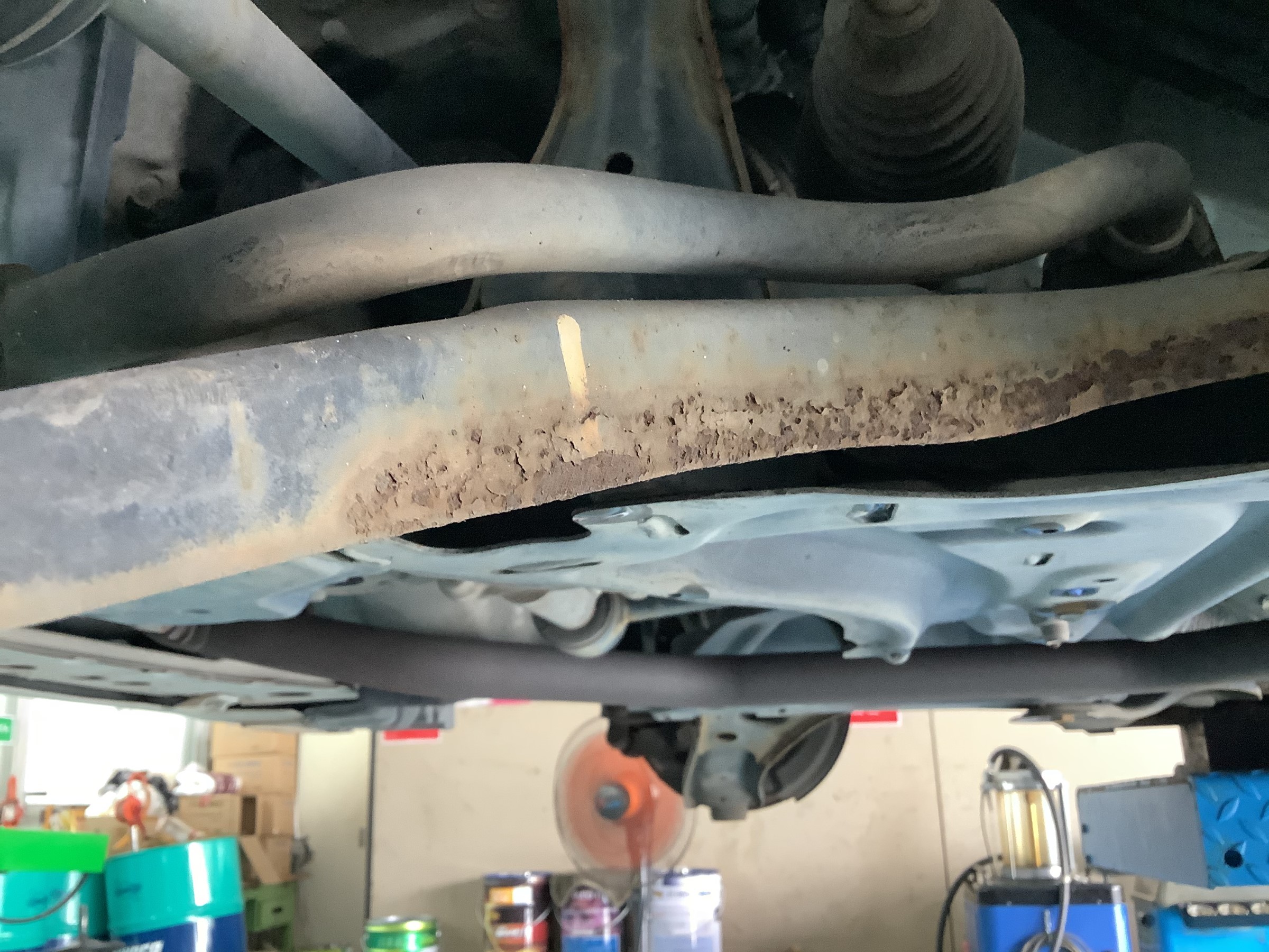 車を持ち上げてみると、足回りがかなりサビていました。