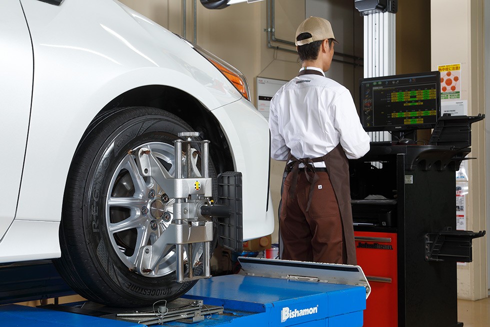 まずはクルマの現状についてどのようなご不満や気になる部分があるのかをおうかがいし、クルマの状態をアライメントテスターで測定します。そのデータをもとに、専門の訓練を受けたスタッフがおクルマに合わせた調整を行います。調整箇所がクルマによって異なりますので、作業時間、料金もそれに伴い変わってきます。詳細については、タイヤ館にご相談ください。