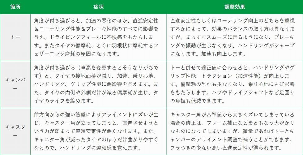 アライメントについてもう少し詳しくご説明しましょう。通常、アライメント調整を行うのはトー、キャンバー、キャスターの3つの角度で、調整可能な箇所はクルマによって異なります。 トーは、直進性とコーナリング性能に大きな影響を与えるアライメント数値です。車体を上から見たときに、タイヤの先が車体に対してどう向いているかを示します。「ミリ」あるいは「°」で表します。一般的に内向きをトーイン、外向きをトーアウトと呼んでいます。