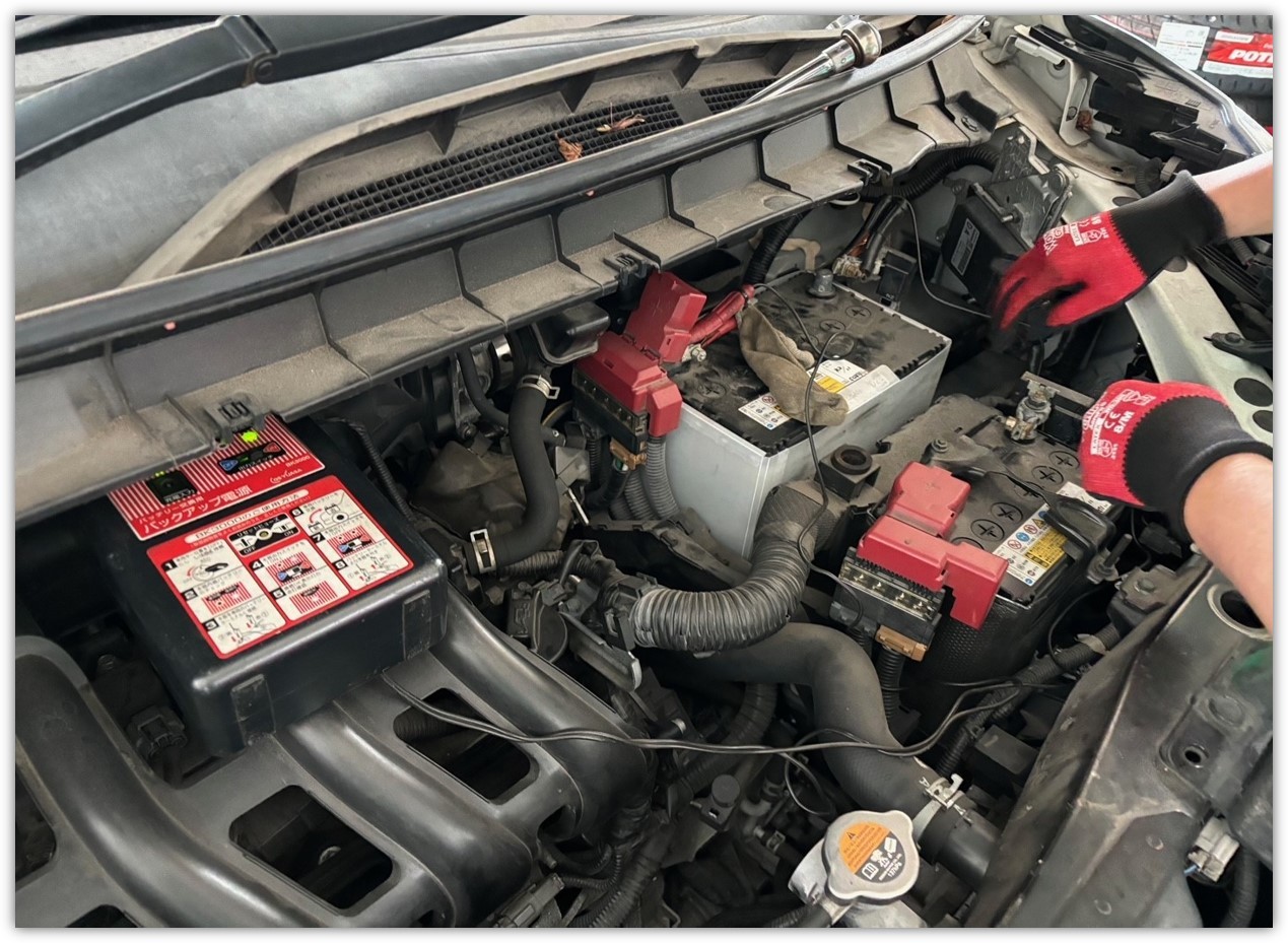 こちらのセレナにはアイドリングストップ車専用バッテリーが2個搭載されています。