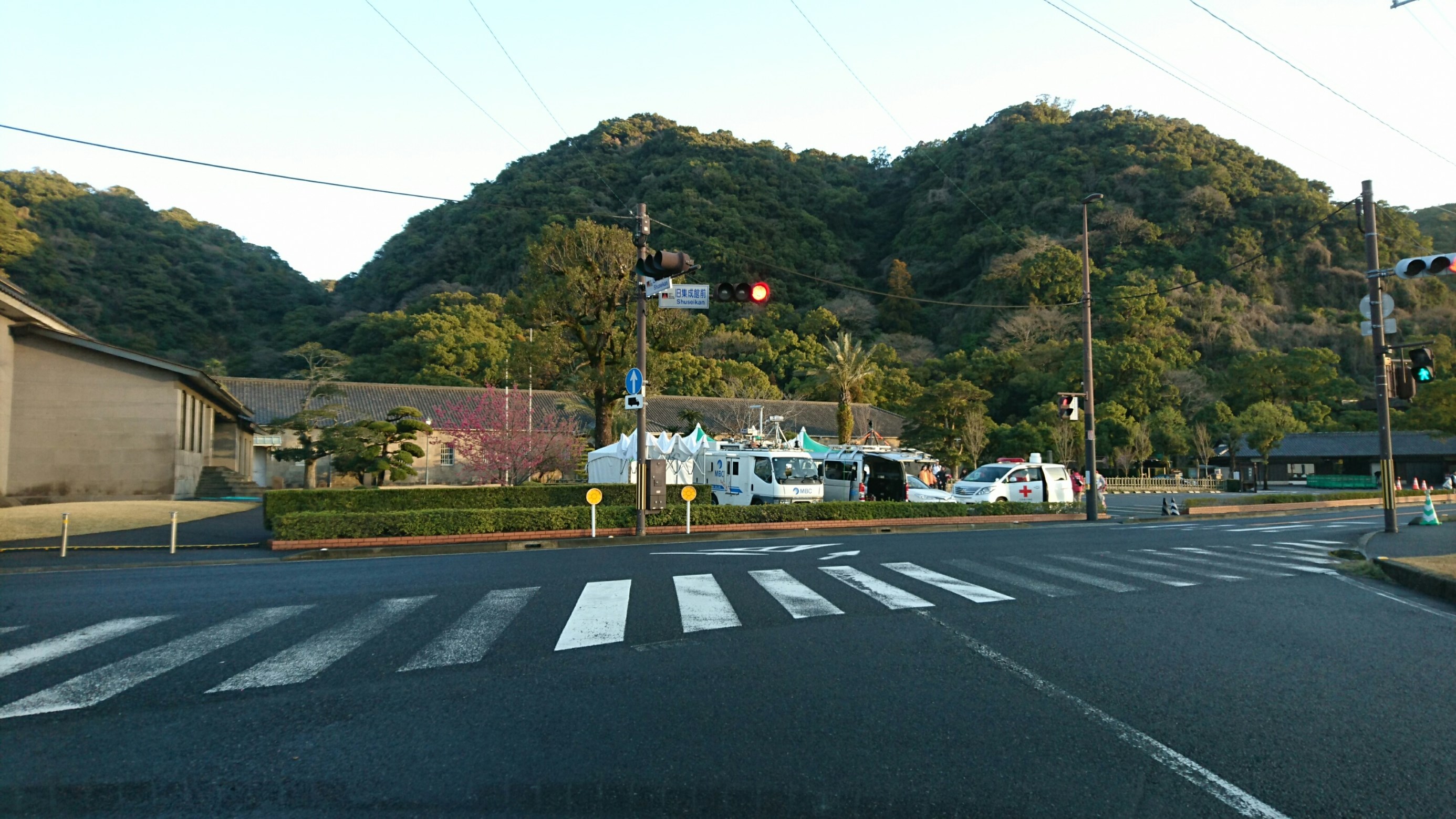 磯の前の信号でTV局車止まっていました