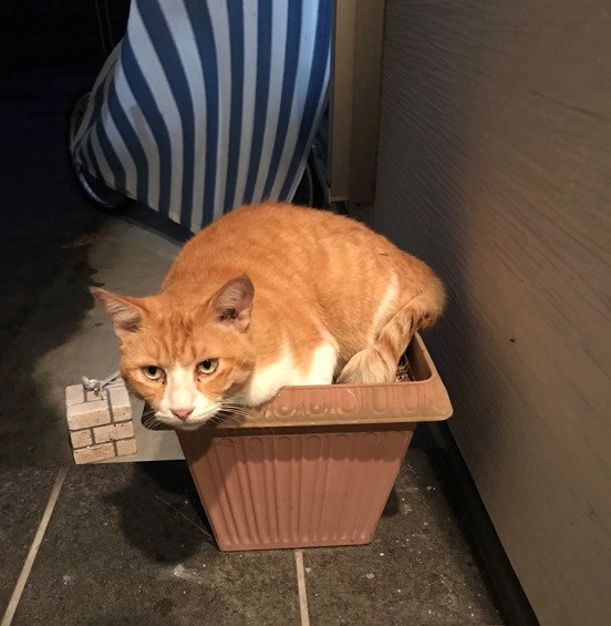 自分のサイズよりはるかに小さい鉢の上に避難していました!