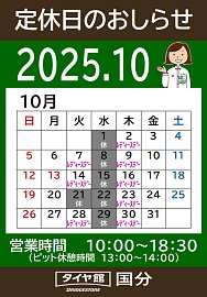 いつもタイヤ館国分をご利用いただきありがとうございます。 10月の定休日は水曜日と21日火曜日となっております。 通常の水曜日の定休日と 21日火曜日も休業日となり 大変ご迷惑をおかけしますがよろしくお願いいたします。 お昼休みのご案内 この度、タイヤ館国分店では、働き方改革の一環とし...
