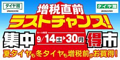 9/14~増税前の集中得市開催!! 期間中店内全品得市特価でご奉仕! 是非この機会にお気軽にタイヤ館国分にご来店ください。 スタッフ一同笑顔でお待ちしております。