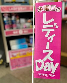 いつもタイヤ館国分のWEBをご覧いただきありがとうございます。 本日、木曜日(12/12)は 女性にお得な【レディースデー】です♪♪ 女性のお客様ご購入でちょっとした日用品の プレゼントもご用意しております♪♪♪ お出かけ前のタイヤの点検・エアチェックオイルの汚れや、バッテリー点検などなどお車...