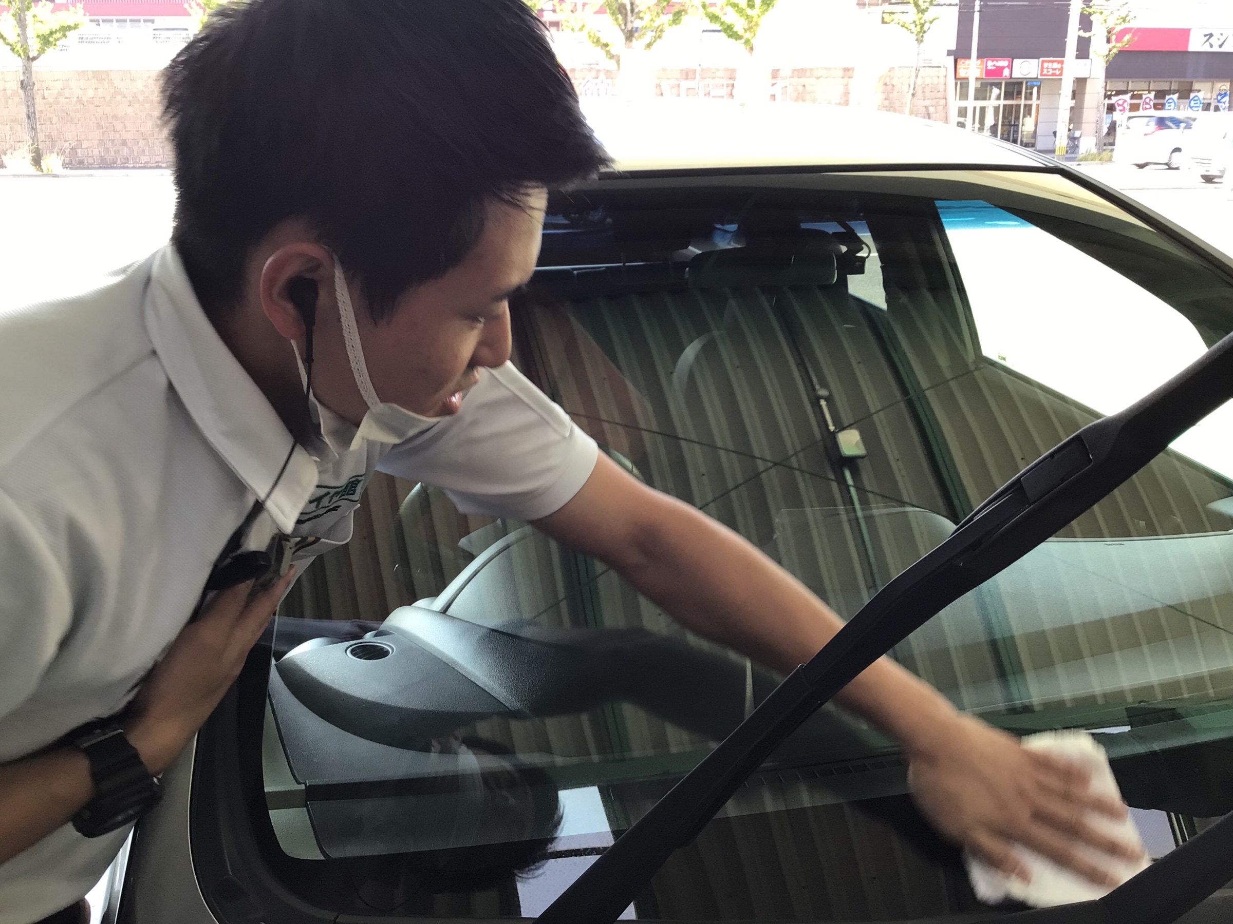 濡れたタオルでフロントガラスについた汚れを拭き取ります!