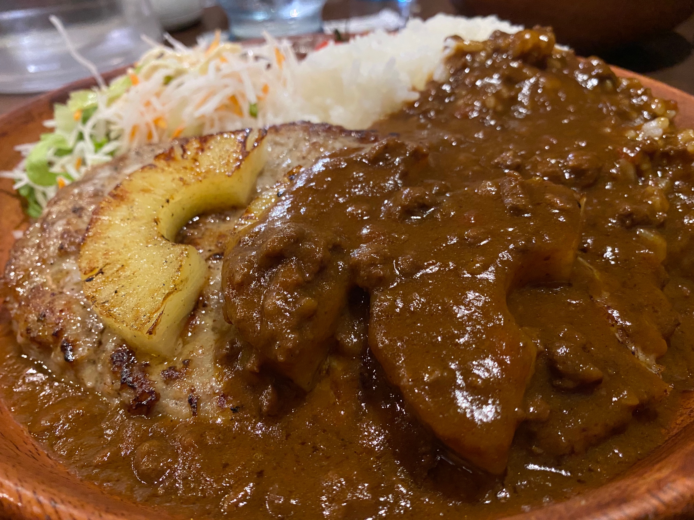 まずは写真をどうぞ!見た目はすごい美味しそうなんですが、よくよく見るとパインが斬新に乗せられてますね。そしてカレーがかかっている。実はカレーがすごく好きなので今回はパインハンバーグカレーを注文してみました!!