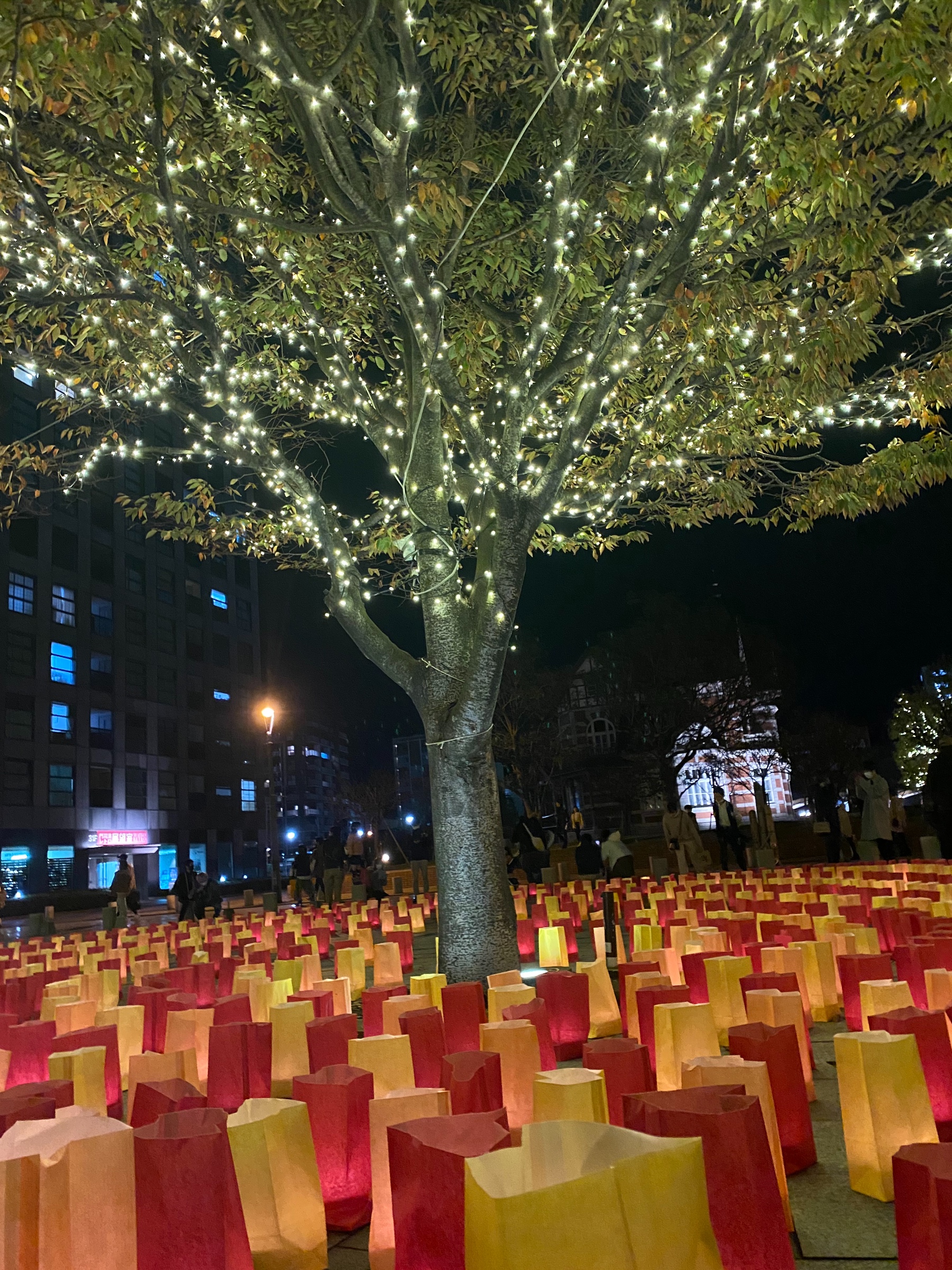 写真をどうぞ!めちゃくちゃ綺麗じゃないですか!?木にたくさんのランプをつけて、そのまわりをキャンドルが囲んで円形に置かれててとても綺麗でした!!