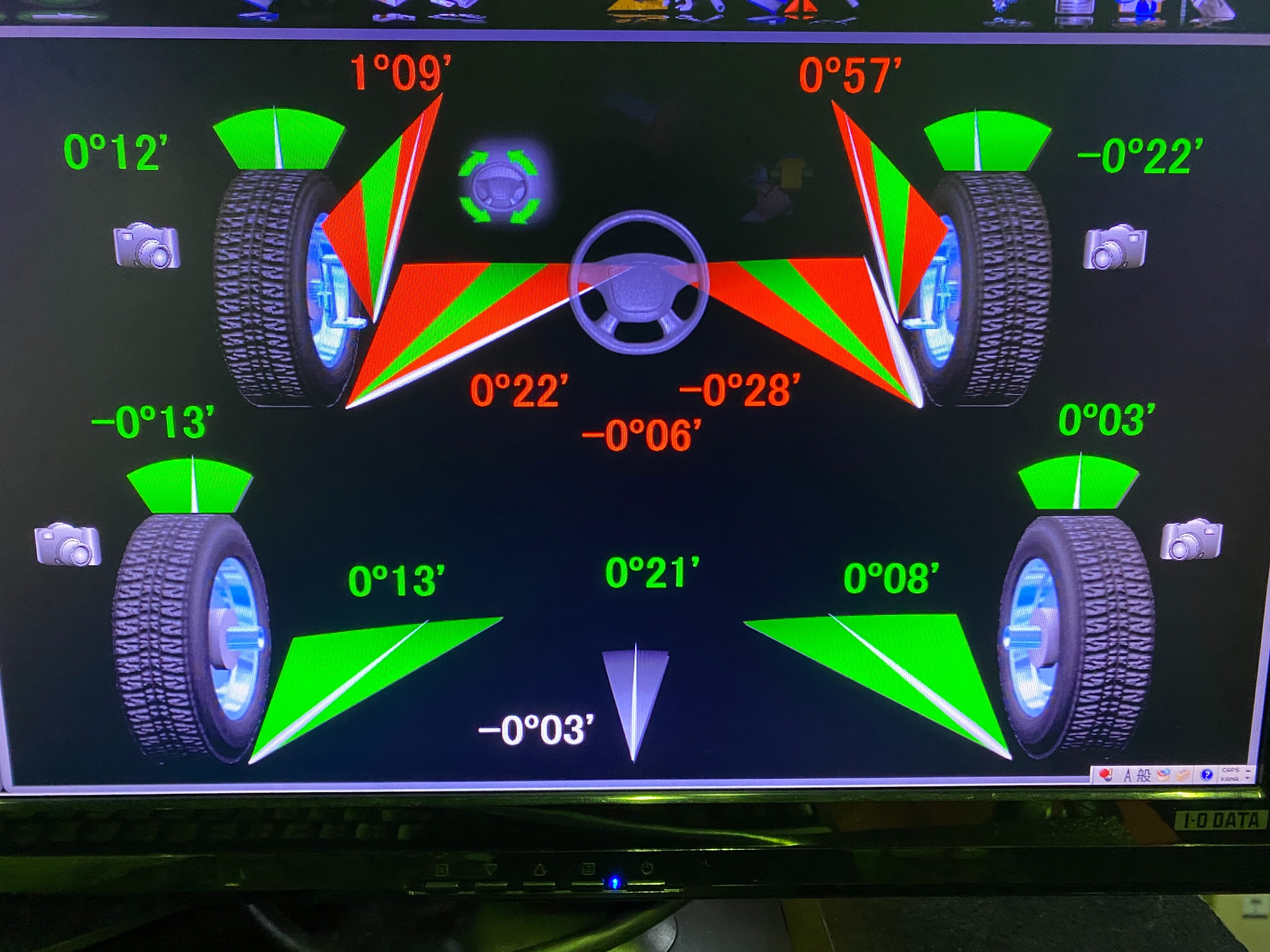 一見見た感じでは、足回りがズレてる事はわかりませんよね。でもセンサーをつけて、計測してみるとこちらが調整前の写真です。それぞれの数値は角度や外側や内側に向いてることを示す度数なのですが、こちらのお車かなりズレてしまってます。