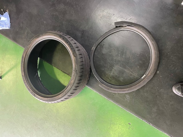 レッカー車で運ばれて来たのですが悲惨なことに…車両内側のビード部分が外れてしまいホイールが着地していました。( ´Д`)y━・~~