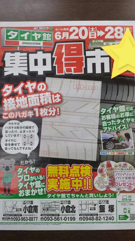 集中得市!! ポスト 2015年6月20日 本日より集中得市!!6月28日まで開催しております♪お得な特価タイヤから人気のエコ&車種別専用タイヤまで、たくさんの商品がお買い得(^-^)オイルやバッテリー、ワイパーなど、メンテナンス用品も充実♪愛車を大切に乗るなら、タイヤ館におまかせ(^-^)♪もちろん、無料安全点検も実施中です!ご来店をお待ちしてま~す♪ 担当:川口