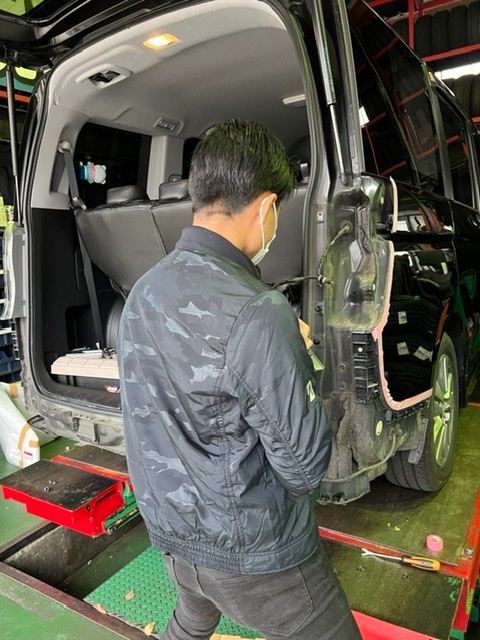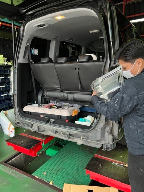 先日お電話いただいたお客様の車の修理風景はこのような感じです…!もうすでにバンパーは取れてます\(^^)/ お客様の大切なお車の部品ですので落とさないように持っております…笑笑なかなか集中力が必要でした^_−☆