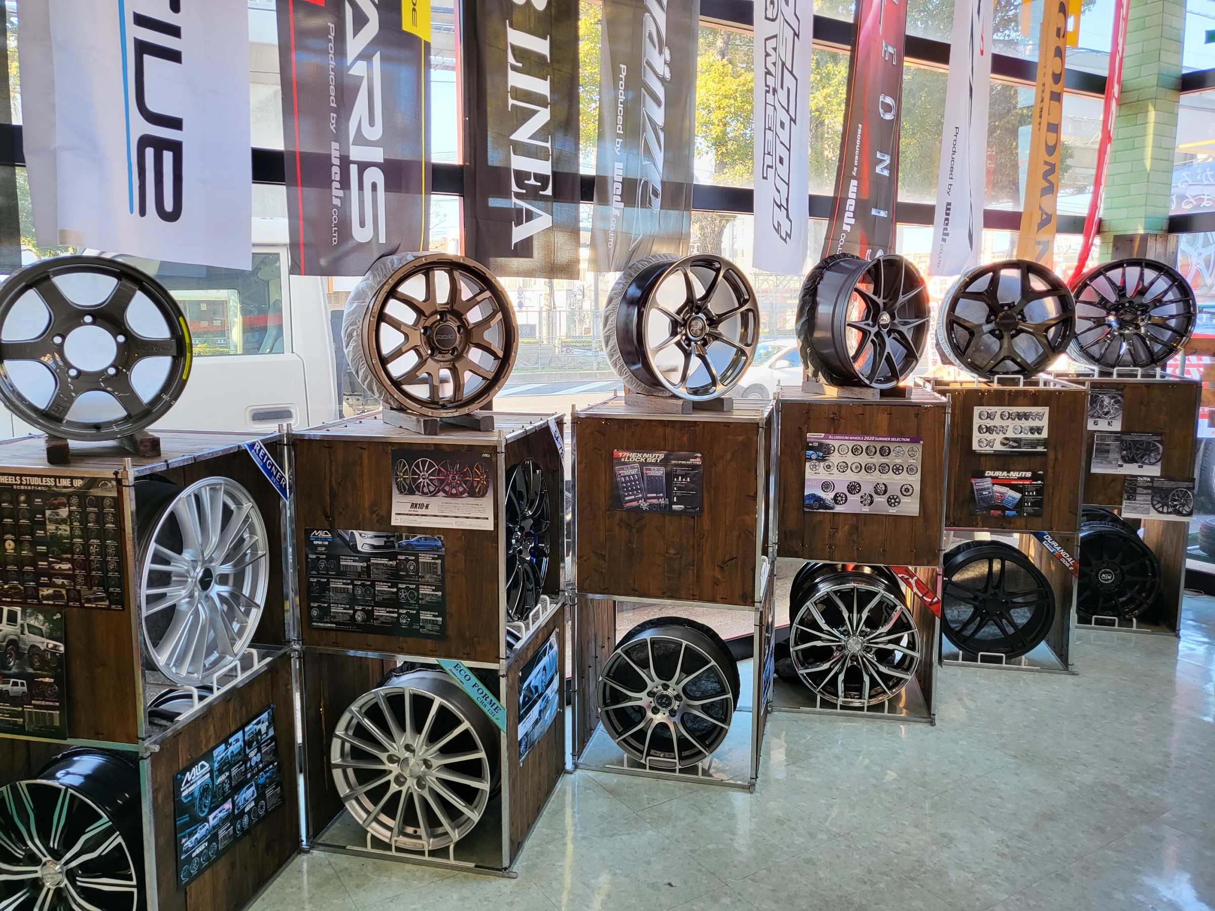 只今ホイールメーカーのRAYSさんより新作ホイールから限定カラーのホイールまで貴重なホイールを展示していただいてます