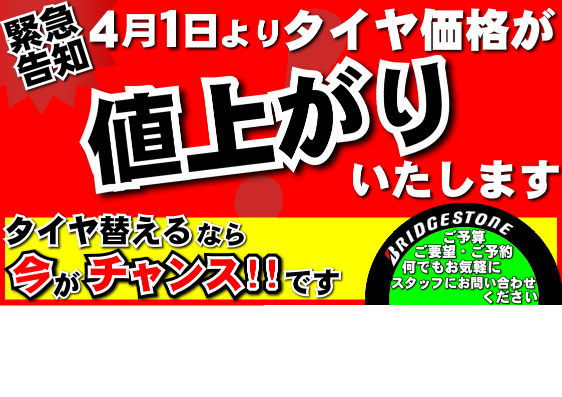 緊急告知 ポスト 2022年2月13日 大変でございます❗ 周知の方もいると思いますが、タイヤの値上がりが迫っております それに伴い当店は4月1日まで緊急セールを行ってます! もしご検討の方がいましたら 交換は今がチャンスです! お問い合わせ、ご来店お待ちしております‼️ 担当:齊藤