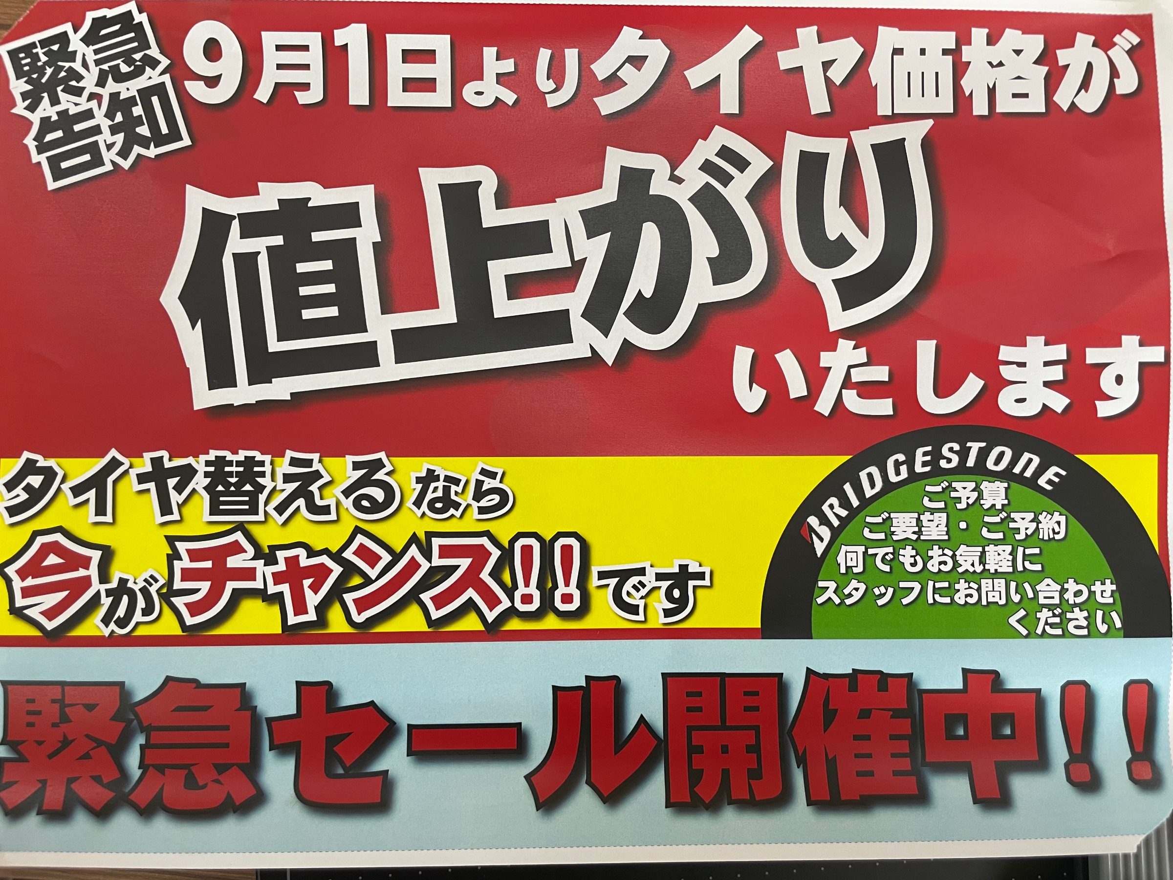 値上がり前セール ポスト 2022年8月4日 こんにちは、武内です! 皆様にご報告があります、タイヤの原材料の価格高騰により9月1日からタイヤが値上がりいたします そこで、その前に当店では緊急セールを行います!値上がり前の超ビッグセールですので皆さまこの機会を逃す手はありません! 普段よりさらにお値引きいたします! タイヤ館小倉南 TEL093-963-8877 担当:武内