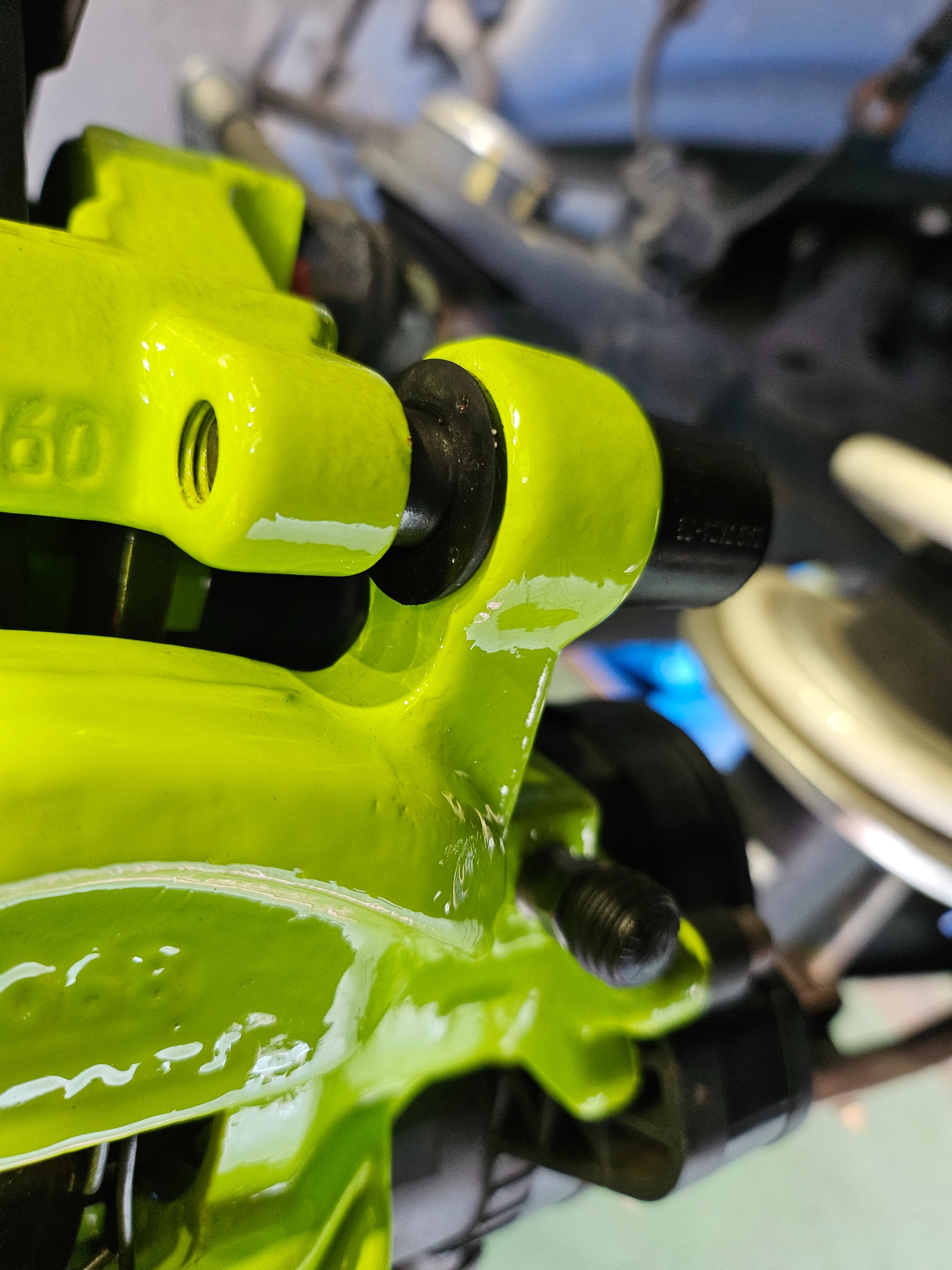 ローターも共に塗りましたがブレーキの当たる場所はあらかじめ余った塗装を剥ぐことにより余計なダストが出るのをなるべく防いでおります
