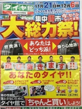 本日よりっ! ポスト 2015年11月21日 本日より、大総力祭やってます‼︎朝からたくさんのお客様にご来店いただいておりますっ\(^o^)/お車の点検は無料ですので、是非タイヤ館小倉南へご来店くださいV(^_^)Vおまちしてまぁーす‼︎ 担当:井上