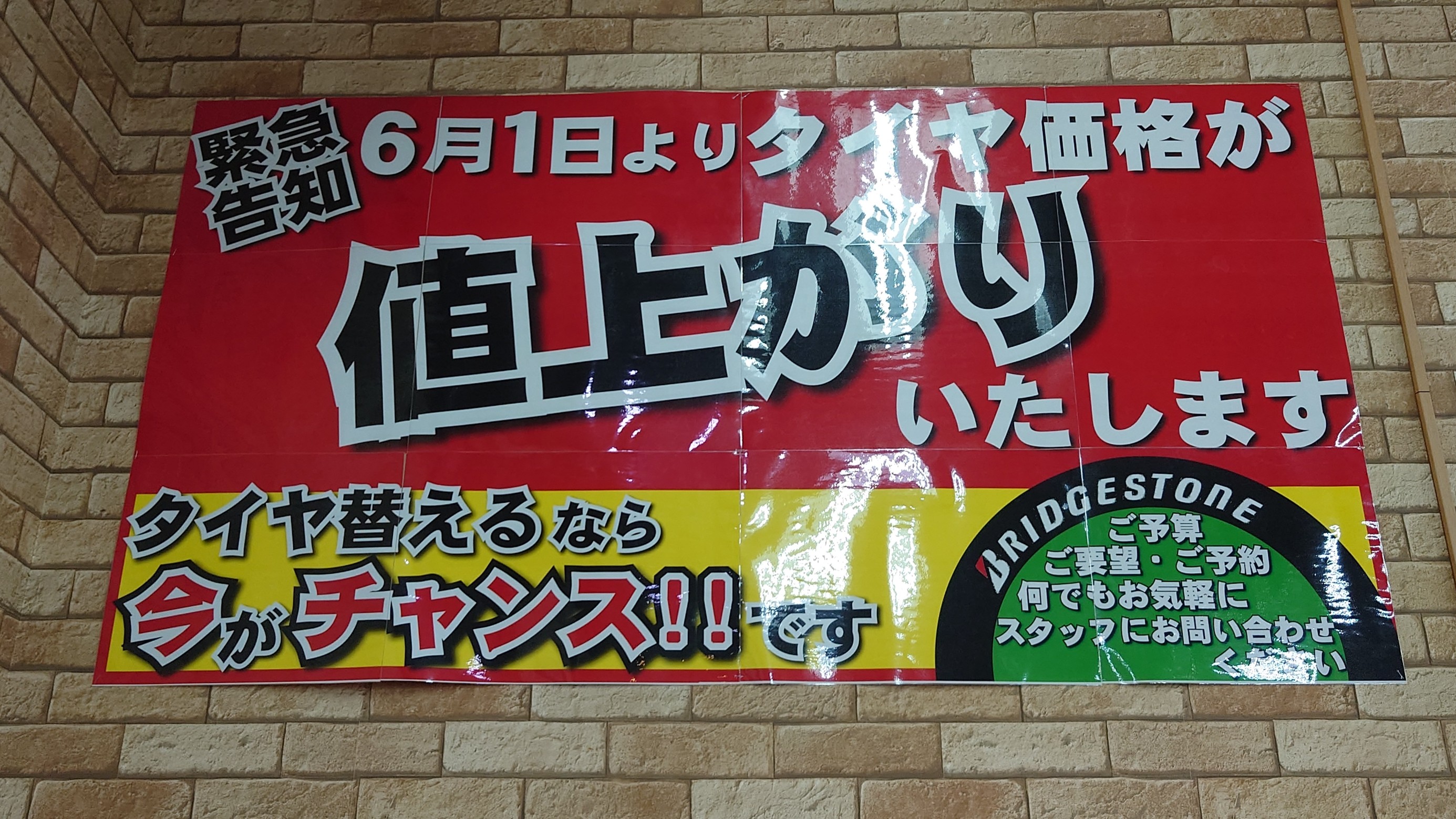 タイヤが値上がるその前に! ポスト 2025年5月22日 どうも皆様こんにちは中野です 誠に残念ながら…来月から タイヤの価格が値上がりします…!! 残すところ9日間… 少しでもお得に購入したい まだ間に合いますので 交換をご検討のお客様は 是非! 当店へお越しくださいませ!