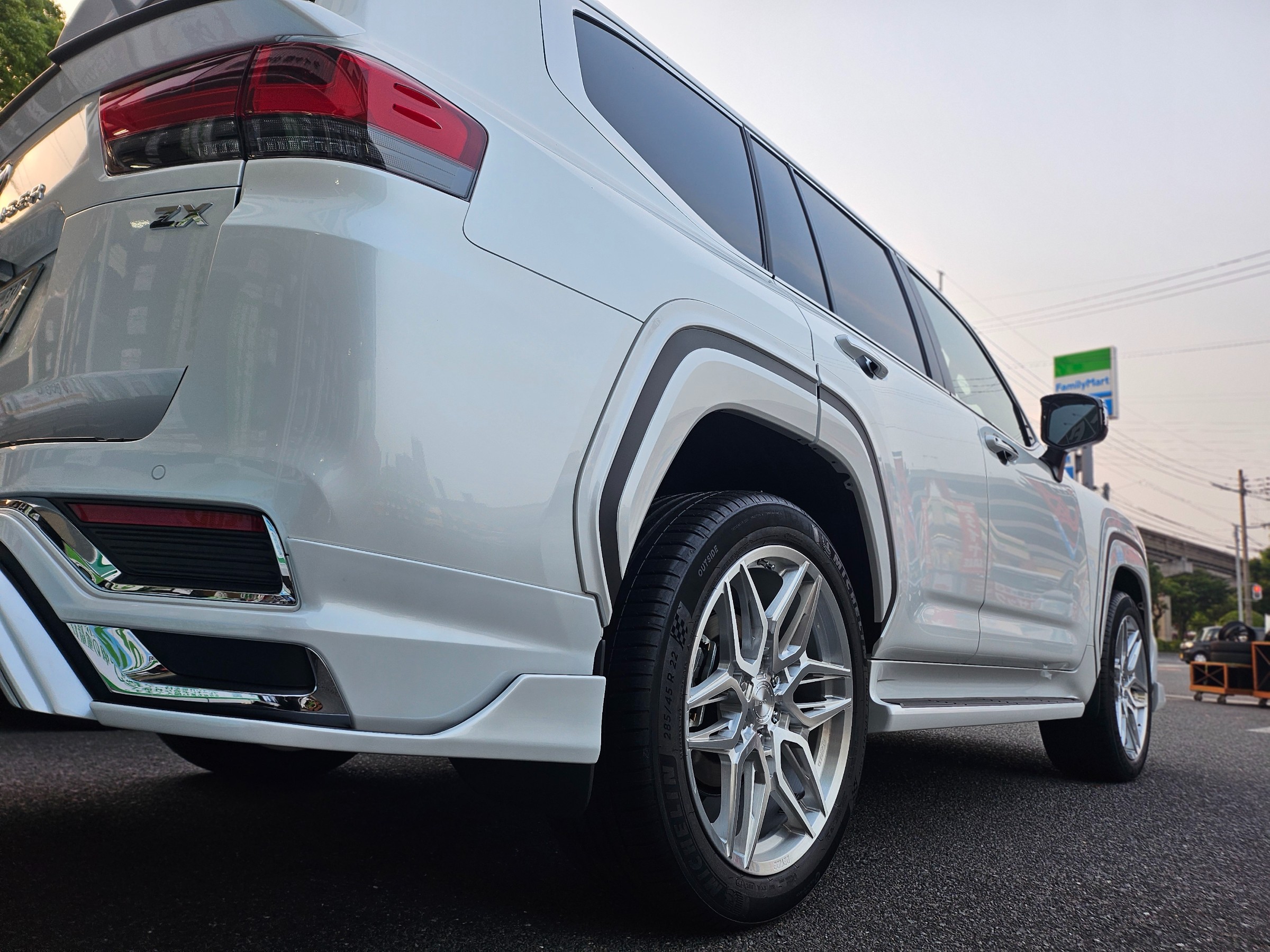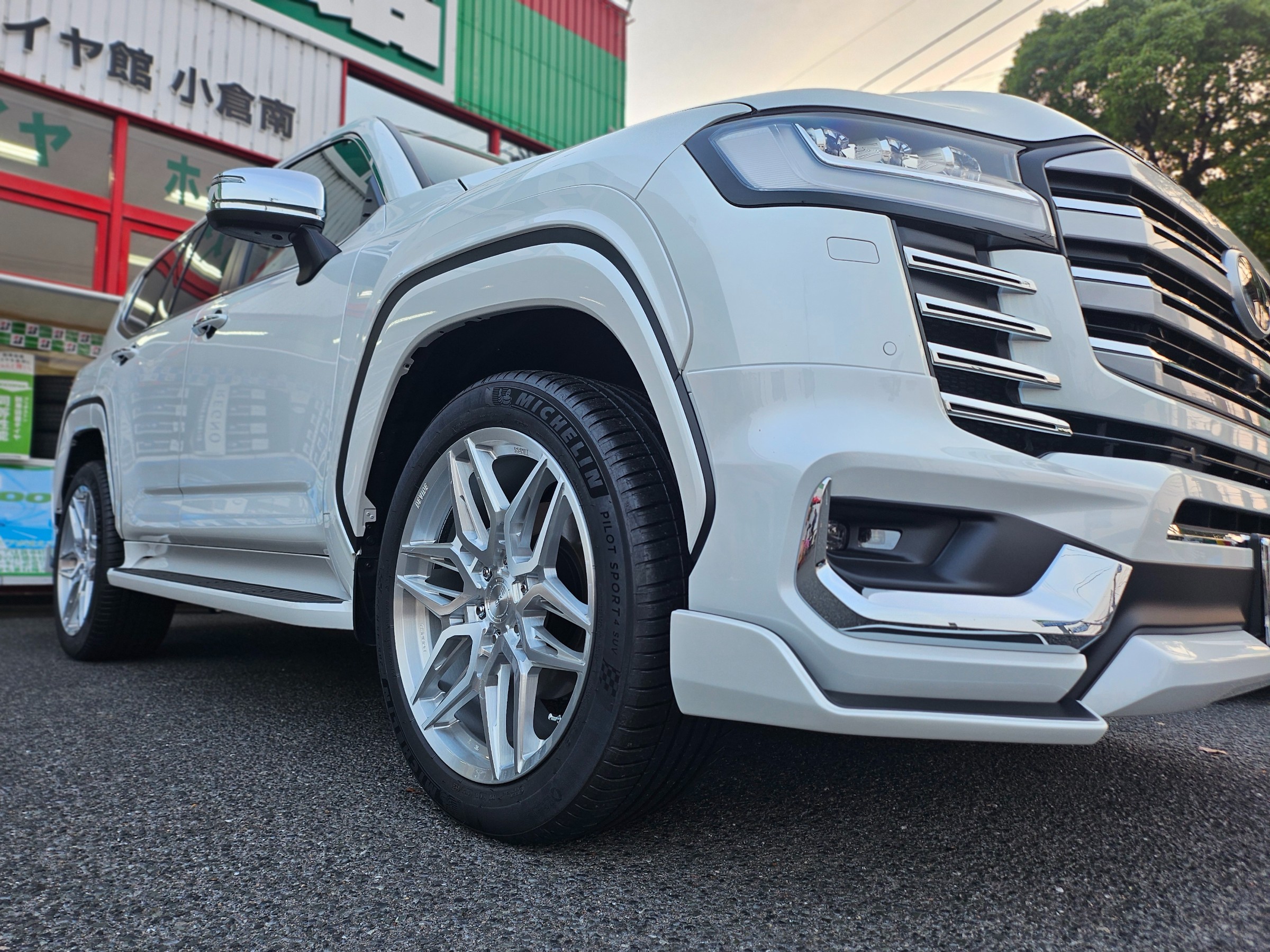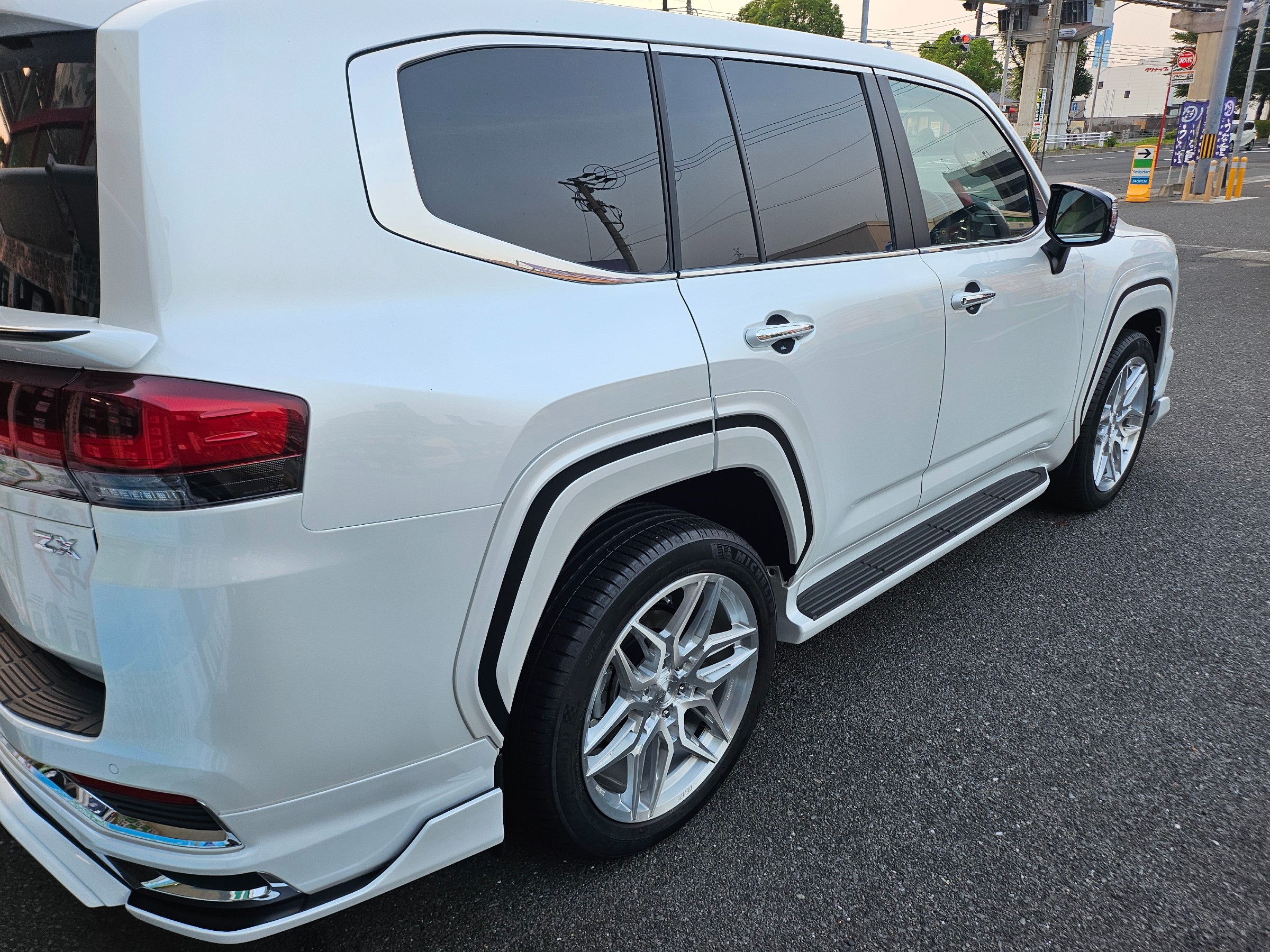 本体のパールホワイトと艶消しブラックとカラーをあわせて、純正のブラックから自然にエアロへとブラックが流れるように演出しました