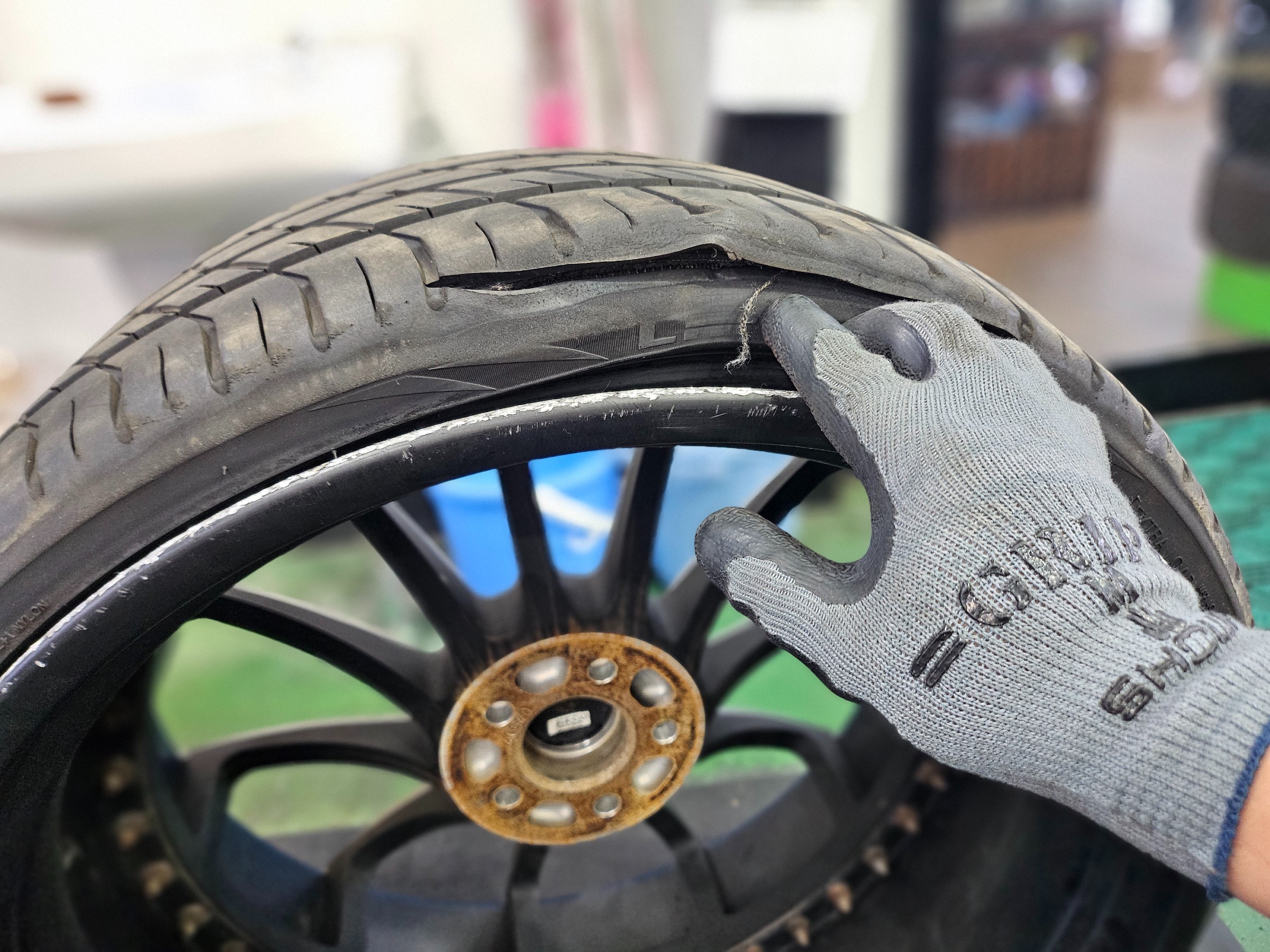 パンクの影響でホイールまでダメージが行ってますね、、
