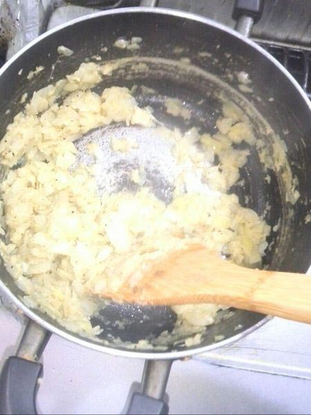 そこにりんごをすって胡麻油、ブラックペッパー、塩コショウ、バターで1時間炒めます
