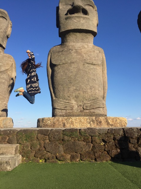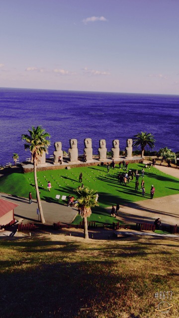 海の地平線がまる~く見える 端っこにきたような絶景の所にモアイが7体 並んでいました!
