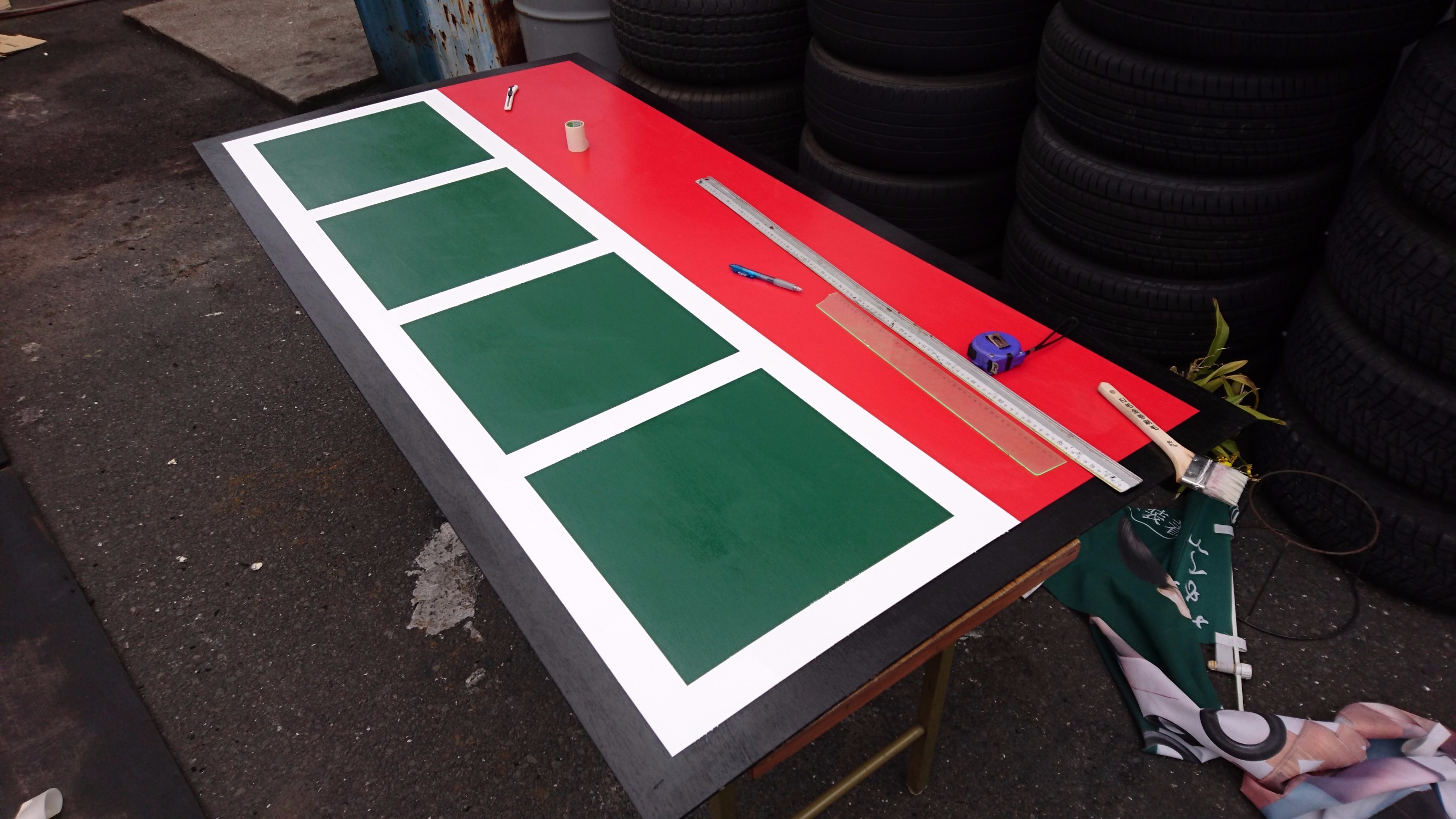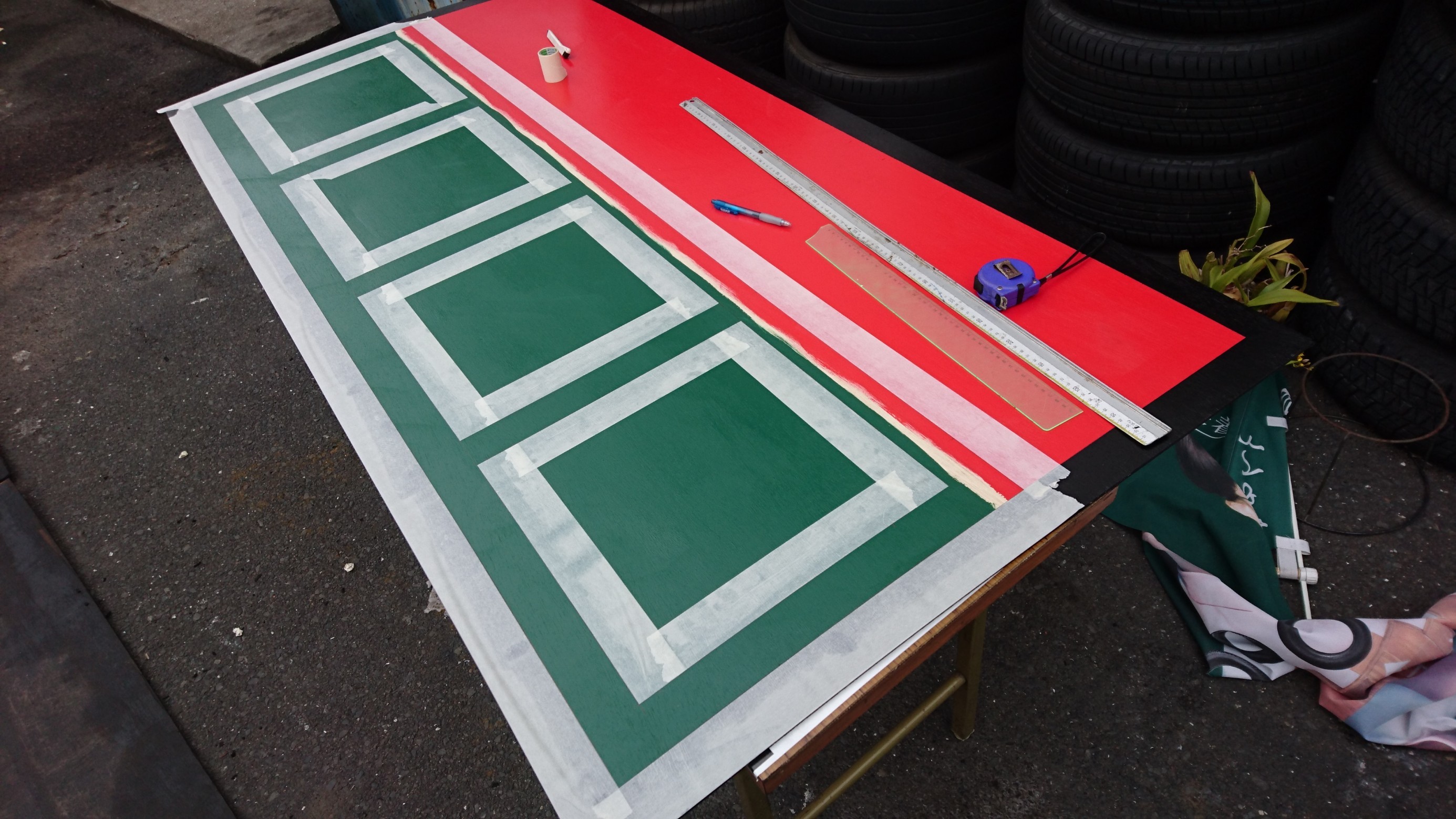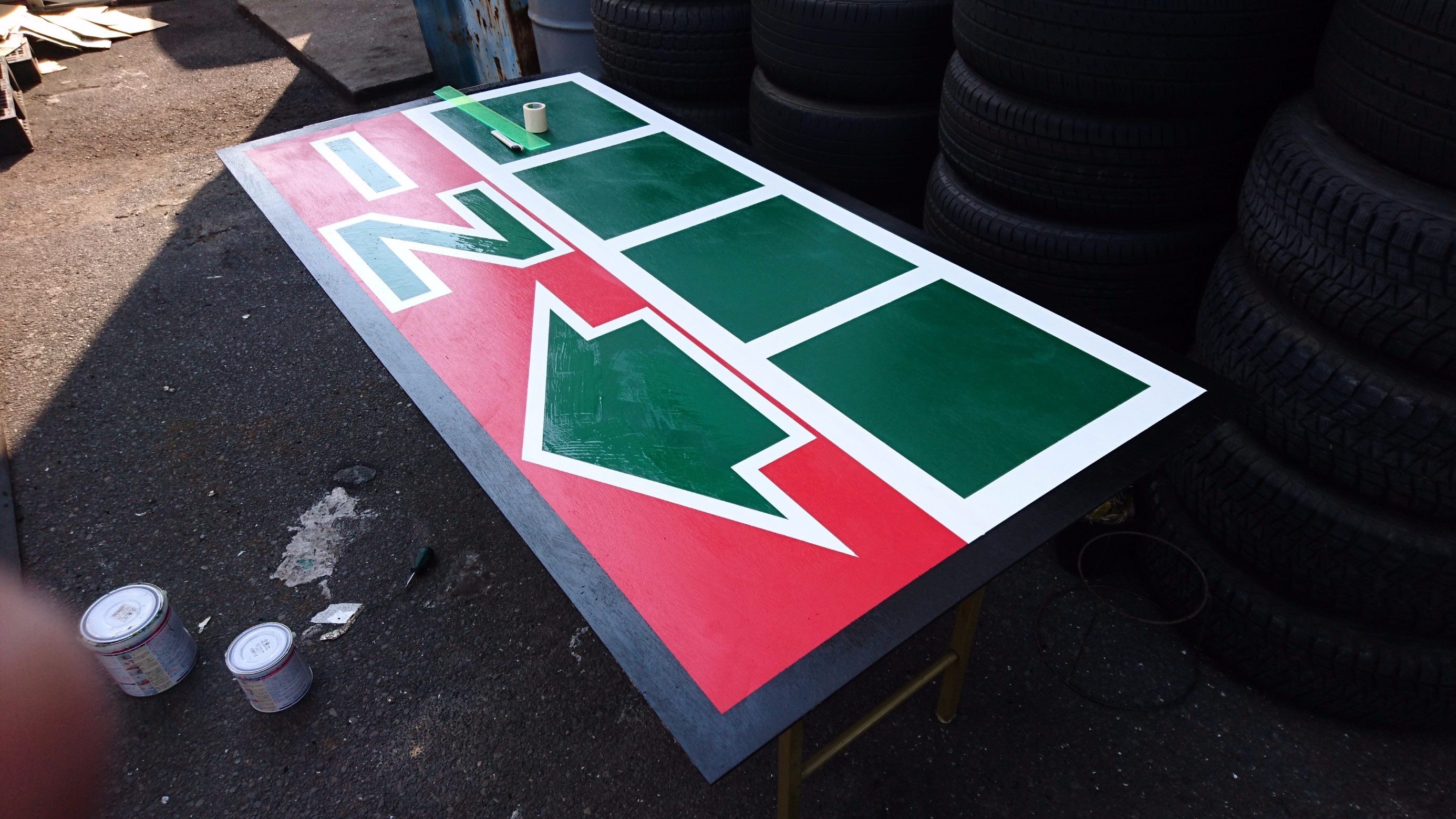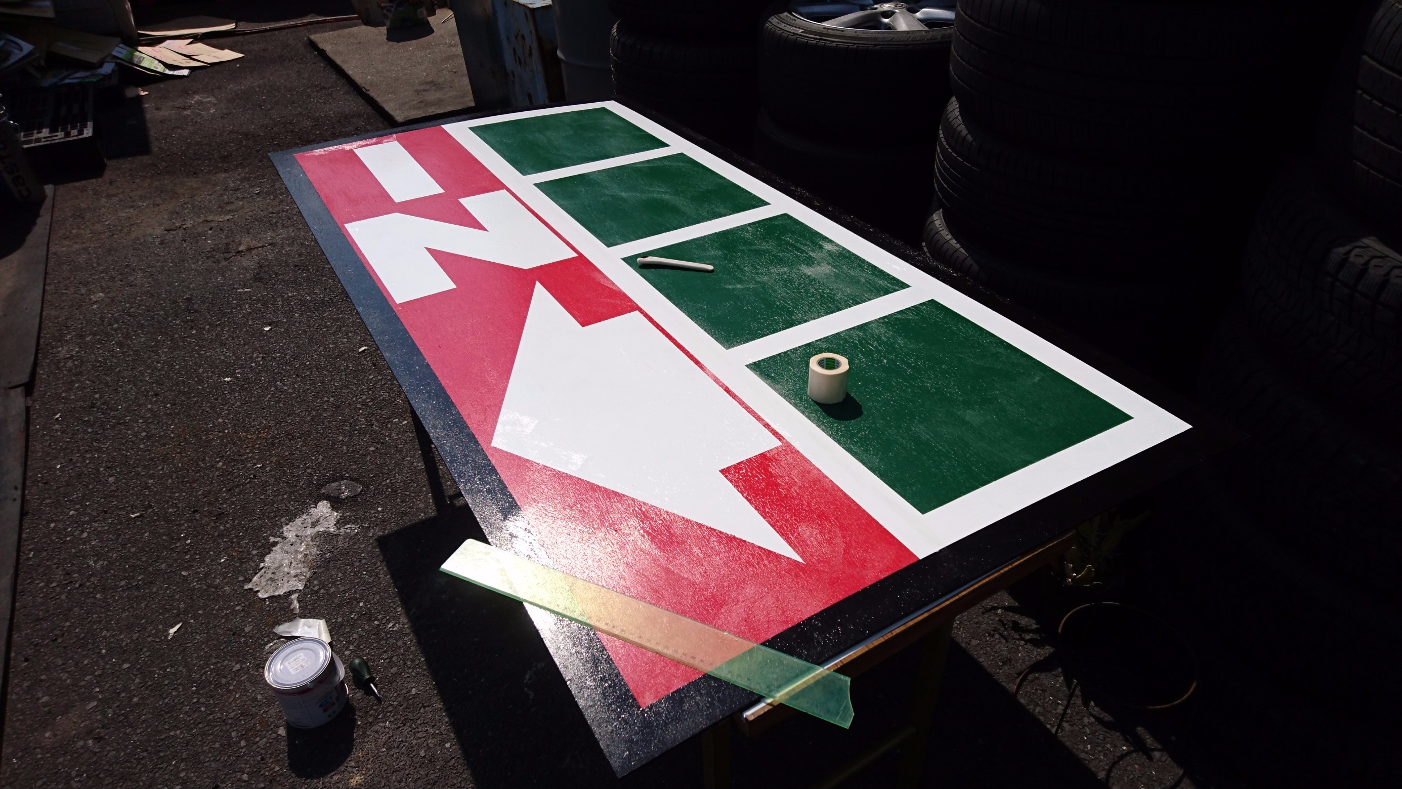 看板2 ポスト 2017年4月17日 看板の続きですよ ここからは緻密な計算と下書きが必要になってきます 下書き通りにマスキングをしてーー ただの真っ直ぐな枠何ですが意外と大変なんです そして色を乗せマスキングを剥ぐと ジャン! 見覚えある枠が登場です 写真で見るとあっという間ですがどんどん行きますよ からのー はい出来ました‼ IN 次がラストです お楽しみに 担当:齊藤