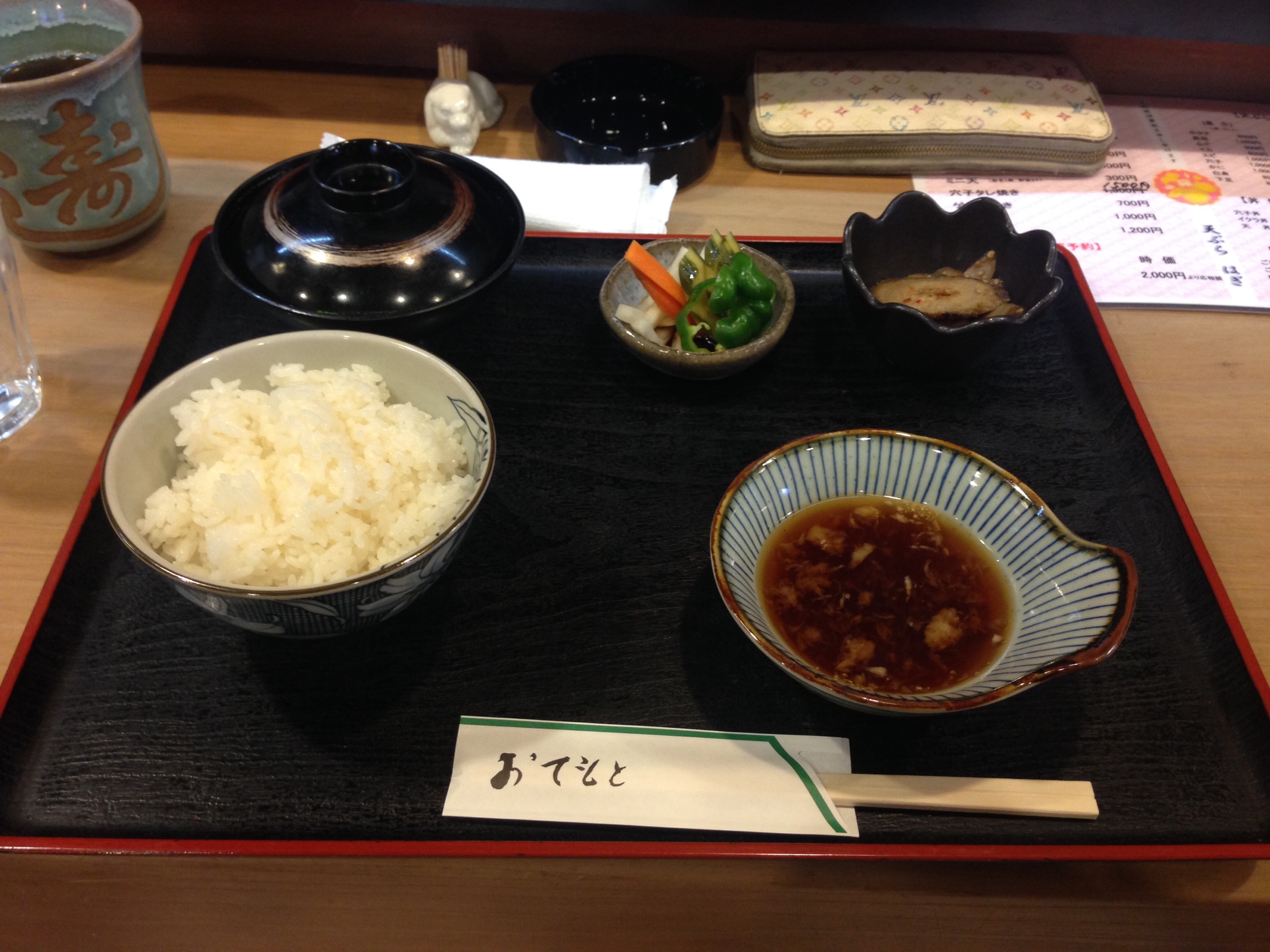 天ぷら定食を頼み現れたのがご飯、つゆ、漬物、ごぼう、味噌汁でした。