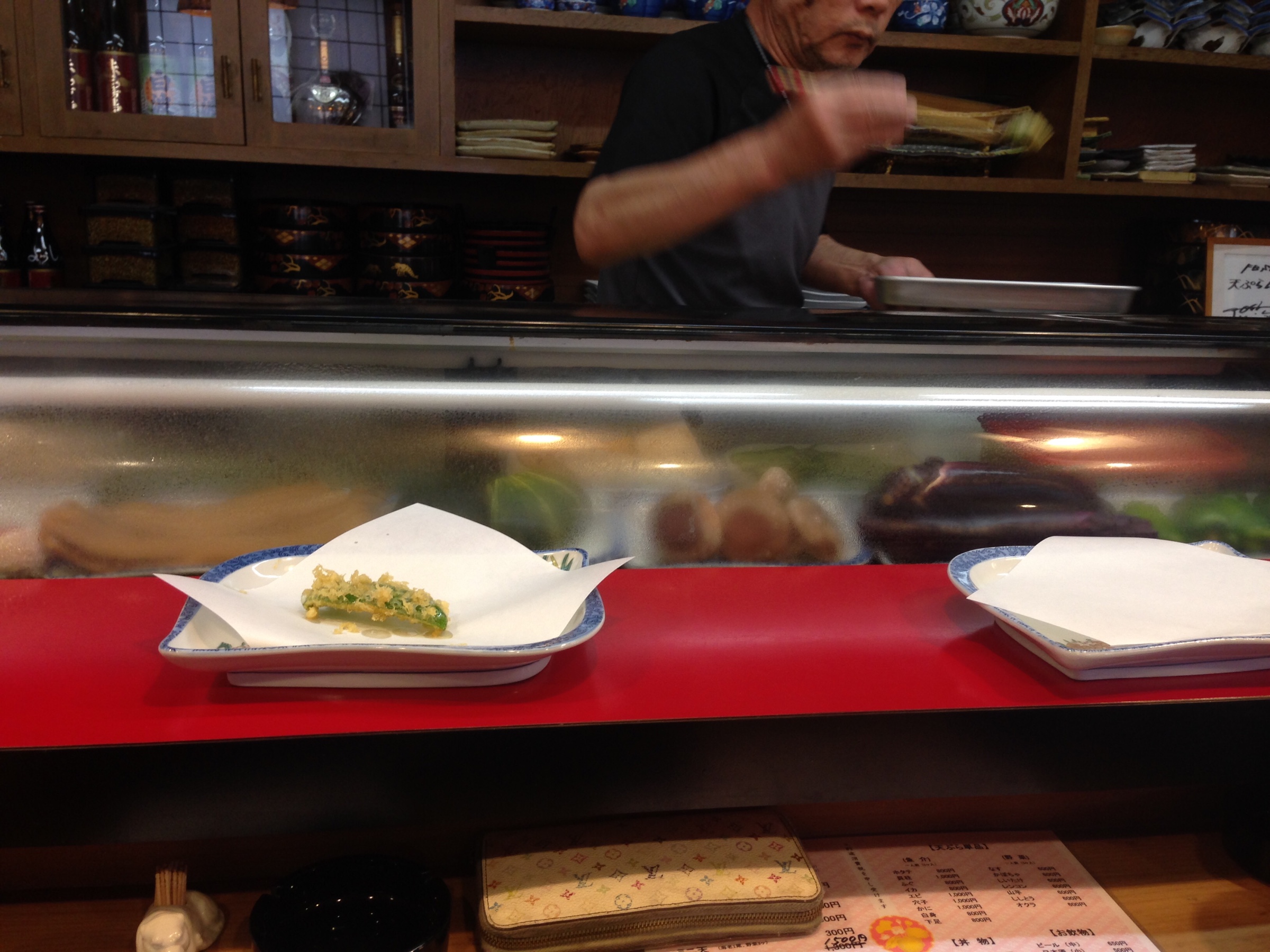 カウンターの上のお皿に揚げたての天ぷらが出てきました!